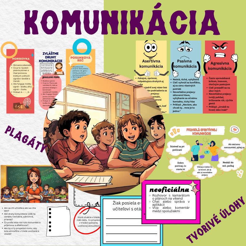 Komunikácia / efektívna, asertívna komunikácia, druhy komunikácie, tvorivé úlohy, plagát, výzdoba, nástenka