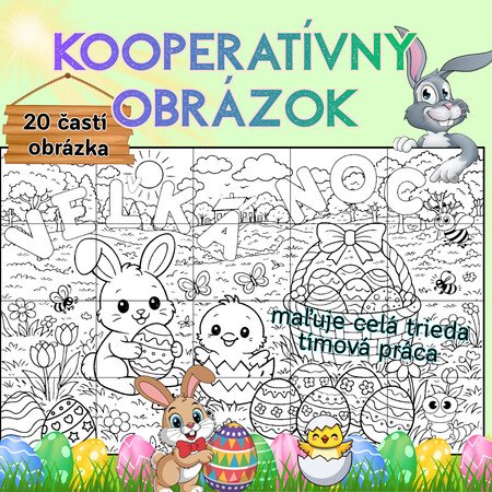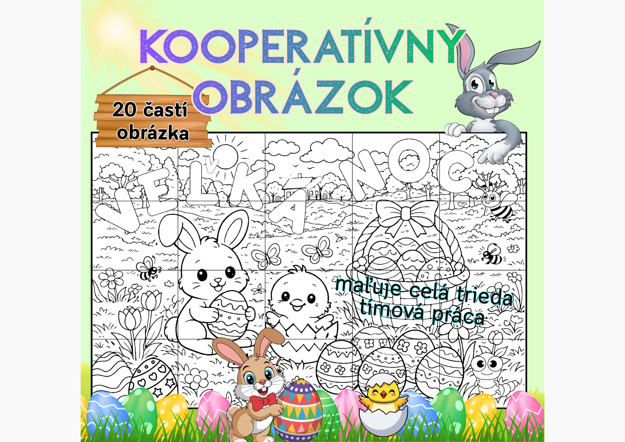Kooperatívny obrázok Veľká noc je rozdelený na 20 častí (20 x A4 formát), ktoré deti spoločne vyfarbujú a skladajú do jedného veľkého obrázka plného radosti a priateľstva.