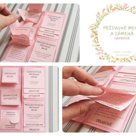 Pri výrobe môjho lapbooku som, pre lepšiu orientáciu, prídavné mená vytlačila na ružové papiere a zámená na žlté.