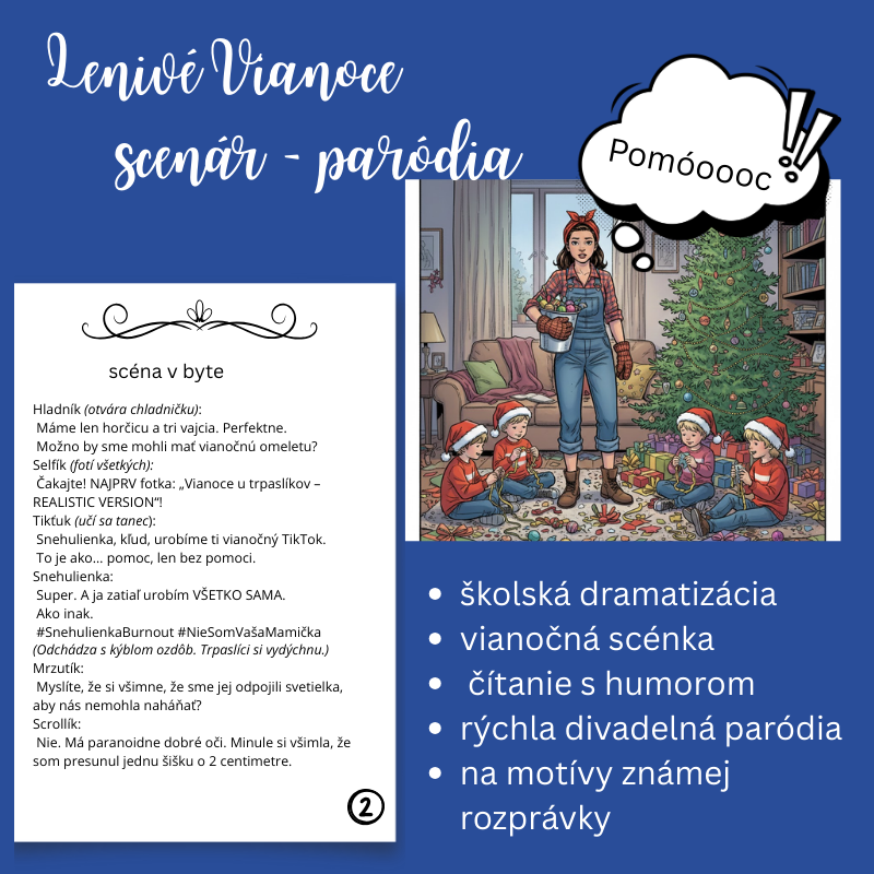 - Scenár obsahuje text a dialógy, odporúčaný playlist - takže je ideálna na: