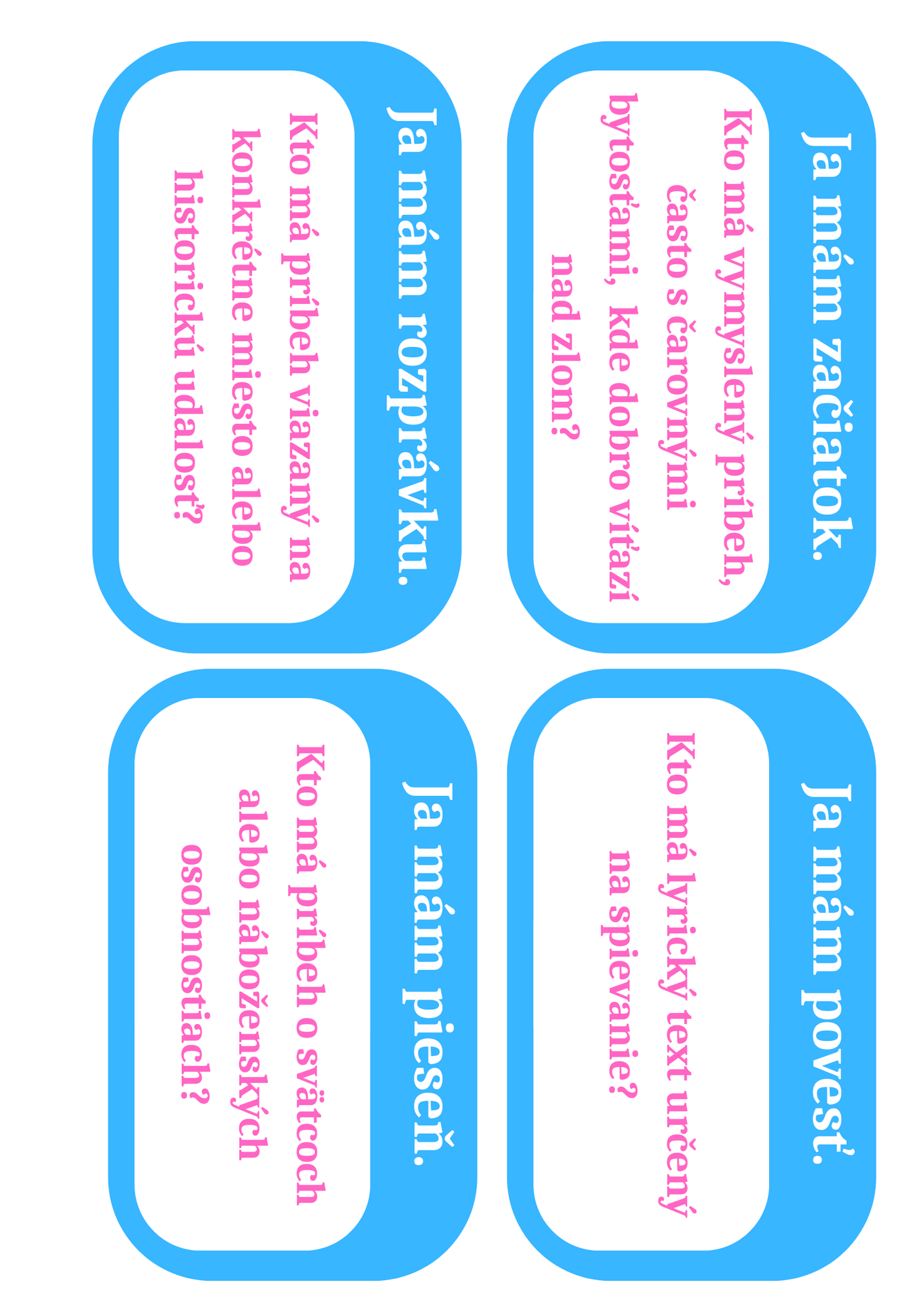 Zahrnuté pojmy: začiatok - rozprávka - povesť - pieseň - legenda - román - anekdota - komédia - bájka - báj - komiks - báseň - poviedka - modlitba - tragédia - balada - aforizmus - rozhlasová hra - hádanka