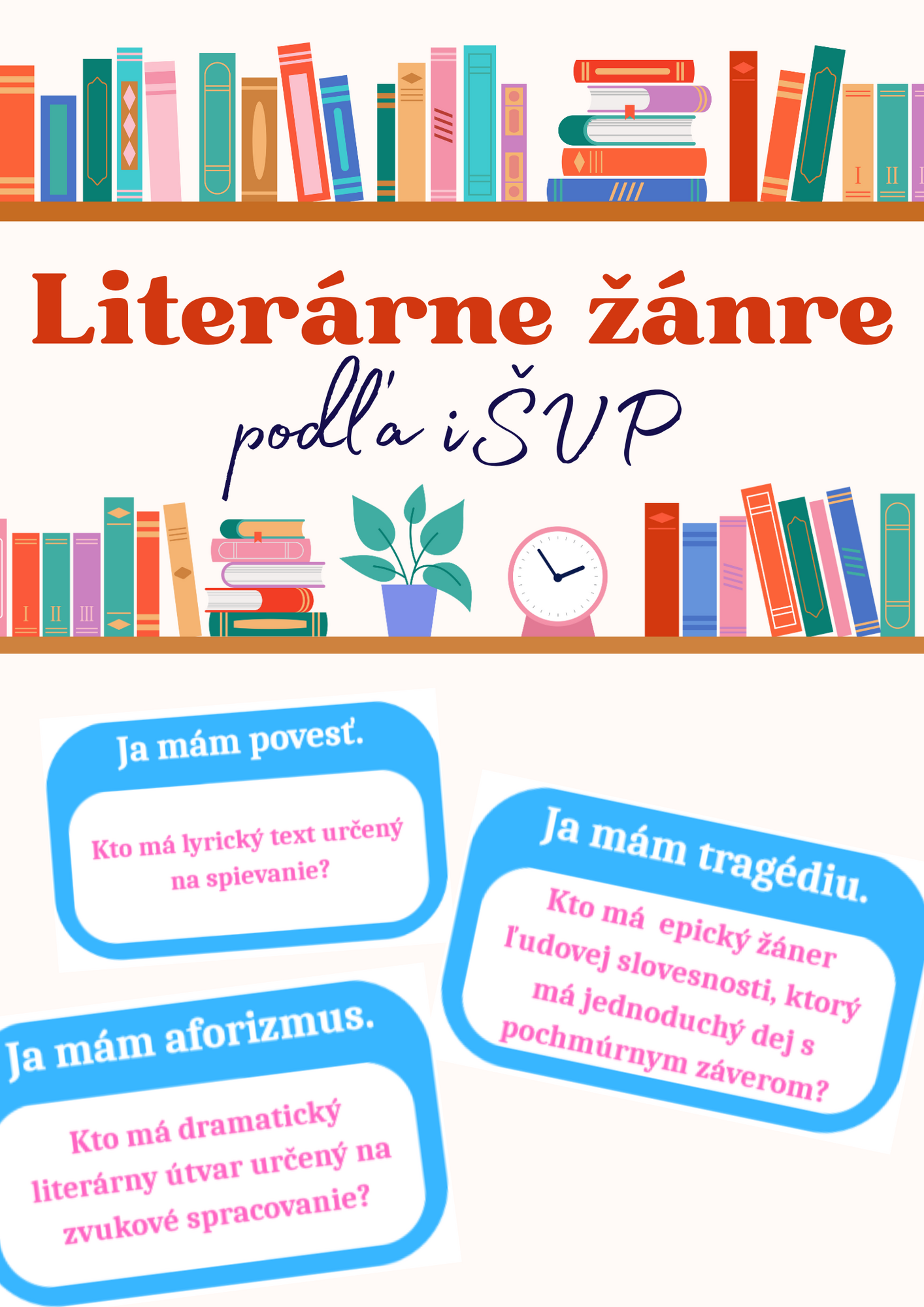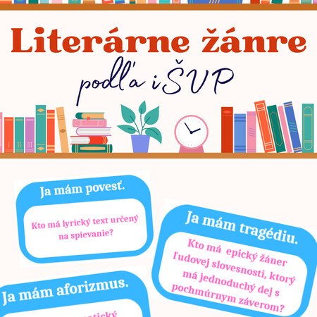 Súbor obsahuje 19 kartičiek na hru Ja mám, kto má. Ja som aktivitu využila na hravé opakovanie všetkých literárnych žánrov pre deviatakov z literatúry. Postupovala som podľa ŠVP a okrem konkrétnejších žánrov (historický román, detektívny román) sú tu zahrnuté všetky. Na poslednej strane ponúkam správne vytvorený rad. Kartičky môžete tlačiť farebne aj čiernobielo. Odporúčam zalaminovať.