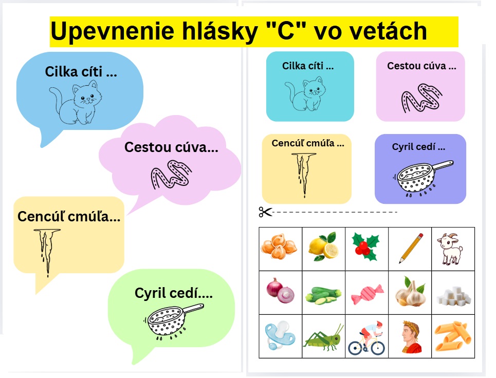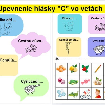 Materiál je zameraný na upevnenie hlásky C vo vete hravou formou. Vhodné na lamináciu. Na prácu s jedným dieťaťom, či v triede.