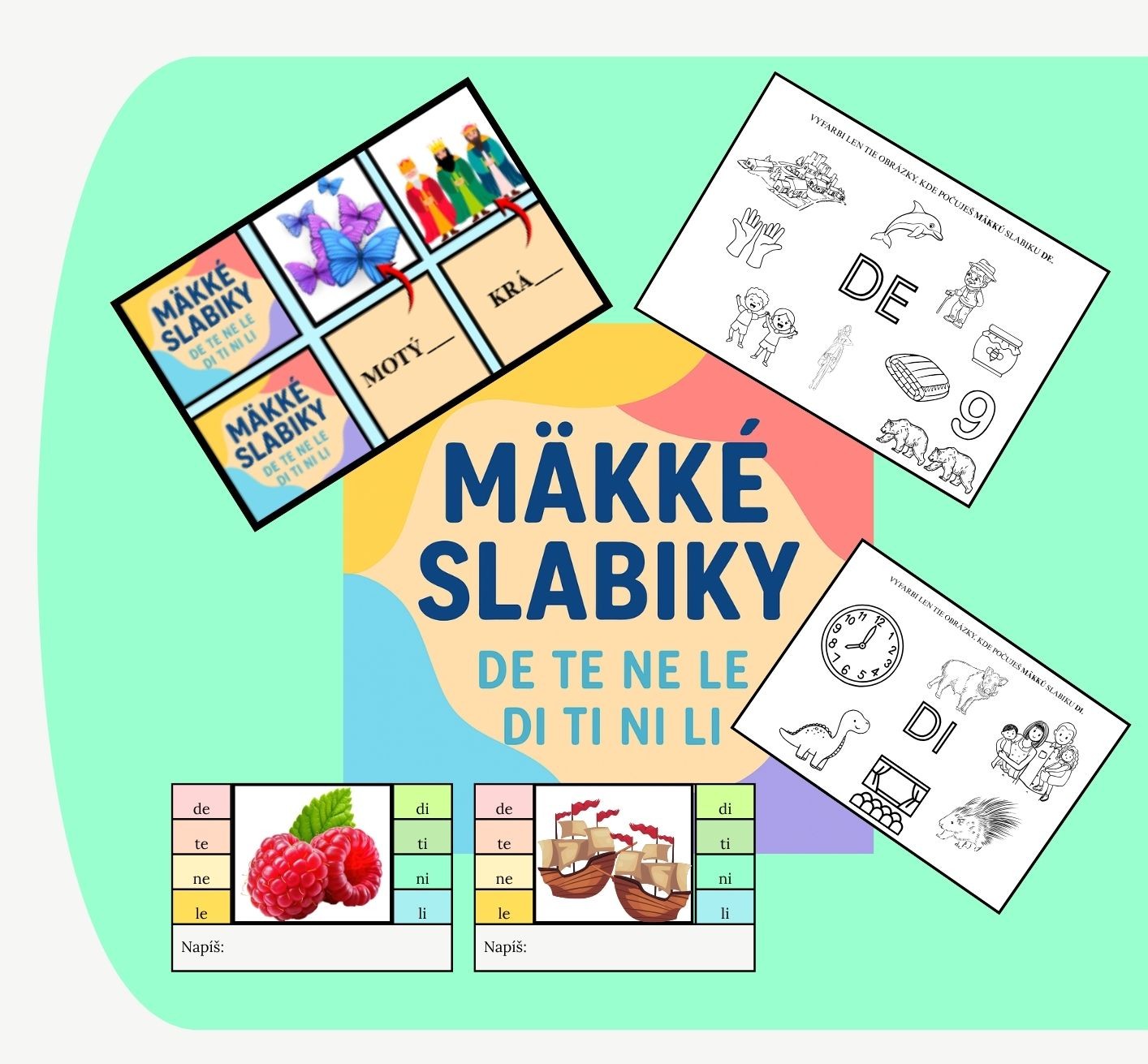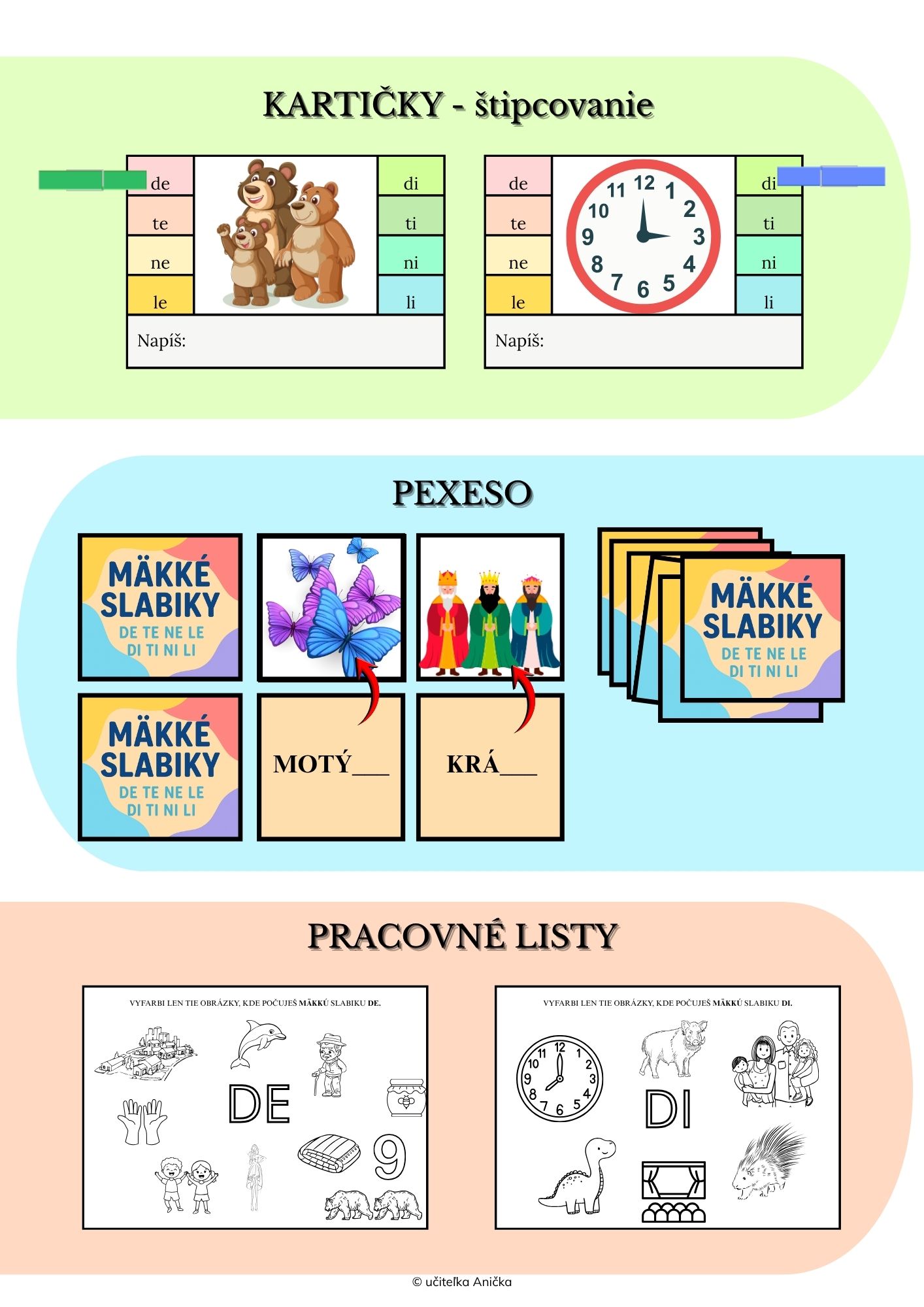 Materiál je určený na nácvik a upevňovanie mäkkých slabík de, te, ne, le, di, ti, ni, li. Je vhodný najmä pre 1. ročník, dá sa využiť aj pri opakovaní v ďalších ročníkoch. Aktivity sú pripravené tak, aby deti mäkké slabiky počuli, videli a používali v slove, vďaka čomu si ich prirodzene osvoja.