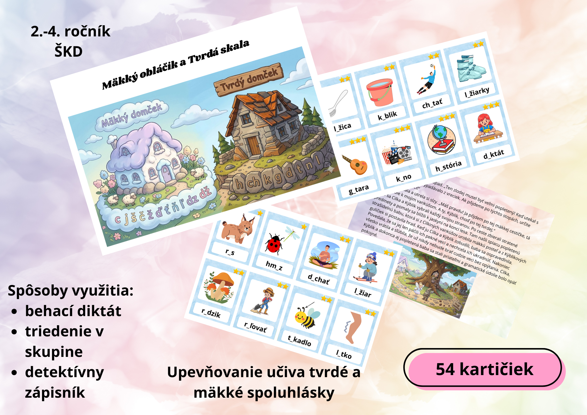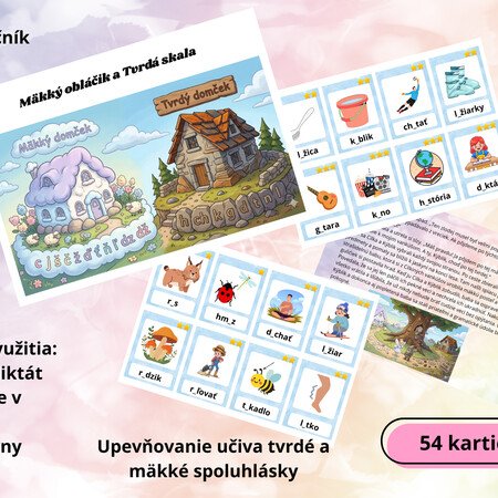 Súbor obsahuje 15 strán na ktorých sa nachádza aktivita na upevňovanie učiva mäkké a tvrdé spoluhlásky. V súbore sú plagáty na využitie k aktivite, 54 kartičiek so slovami, príbeh na porozumenie.