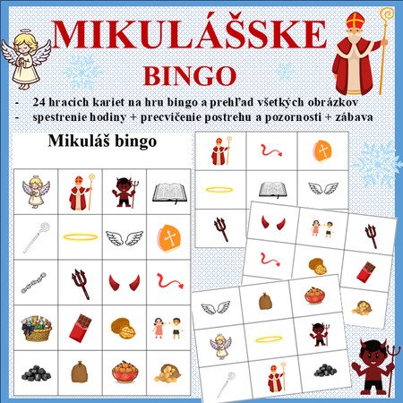 Vďaka hre Bingo si deti krásne precvičia postreh, uvedomia si a zopakujú si pomocou obrázkov tradičné symboly spojené so dňom sv. Mikuláša a zároveň sa zabavia.