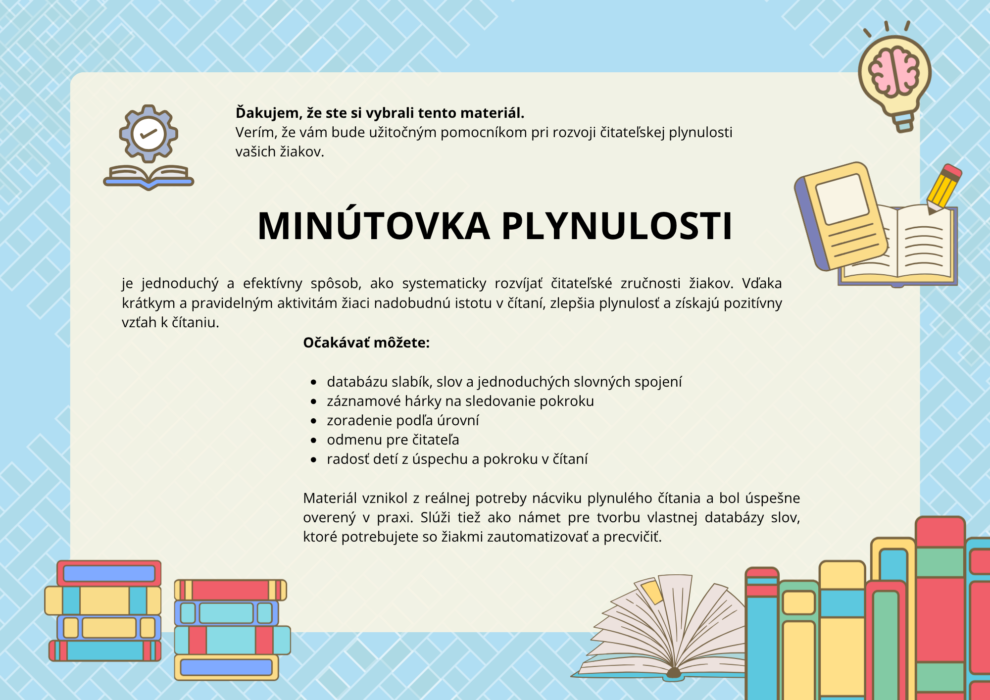 Minútovka plynulosti ponúka krátke, systematické aktivity na rozvoj čítania s meraním času a sledovaním pokroku. Žiaci pracujú s rôzne usporiadanými slovami, čím sa podporuje skutočné čítanie bez memorovania.