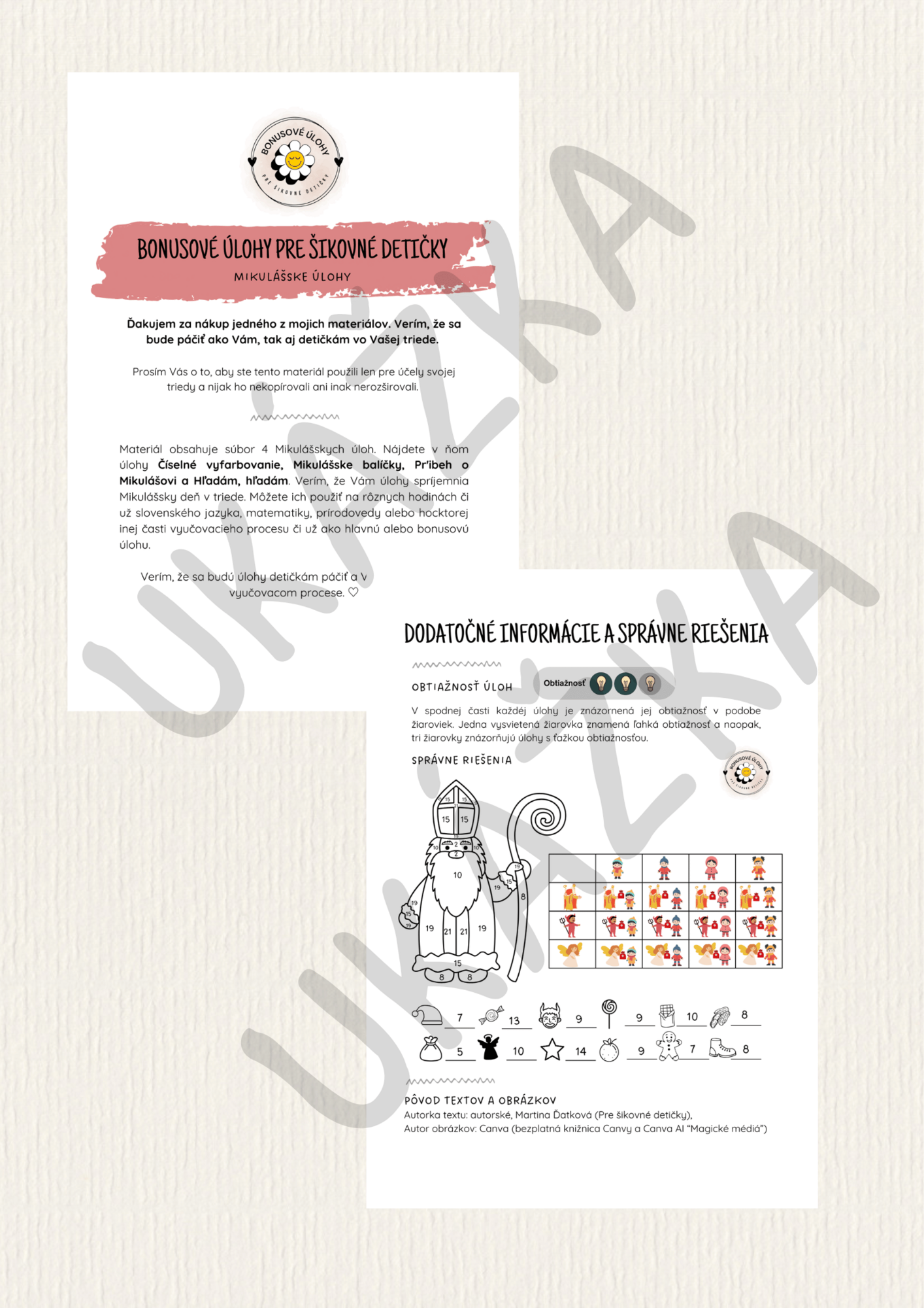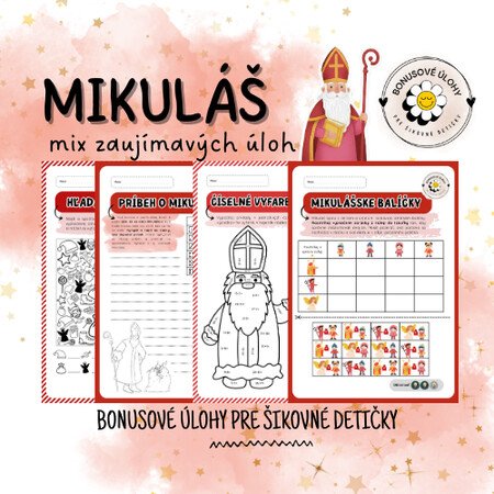 Súbor obsahuje 4 rôzne mikulášske úlohy 🍬, ktoré sú vhodné na využitie počas Vášho mikulášskeho dňa v triede. Je ich možné využiť ako doplnkovú či bonusovú úlohu pre detičky, ktoré už skončili so zadanou prácou. Sú vhodné pre rozvoj fantázie i tréning pozornosti.