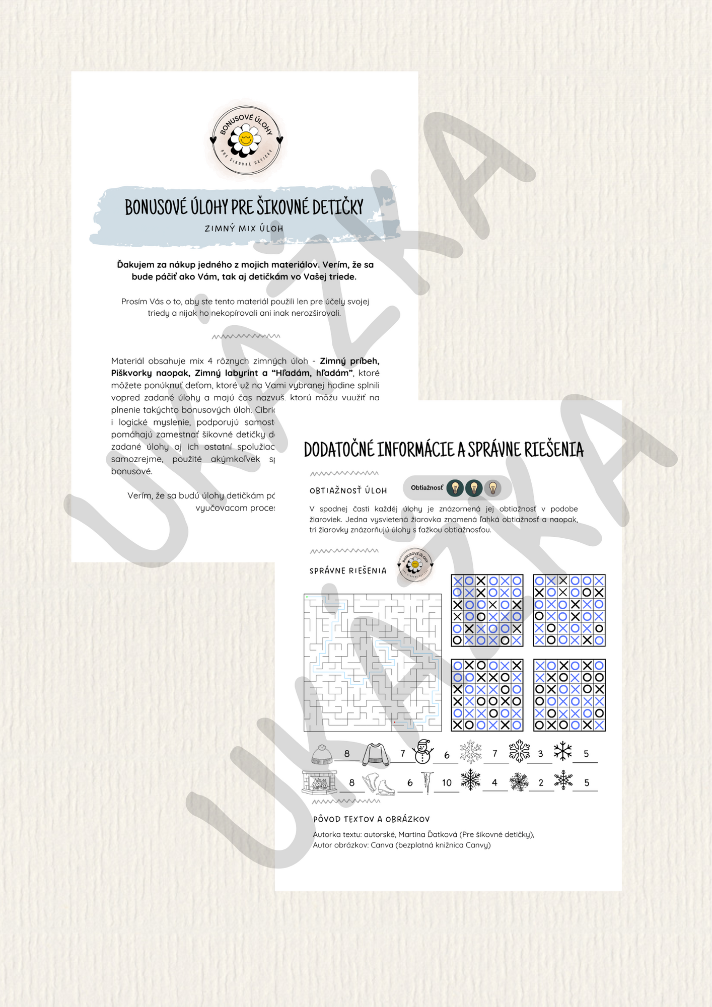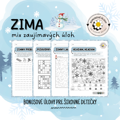 Súbor obsahuje 4 rôzne zaujímavé úlohy so zimnou tematikou ❄️☃️, ktoré sú vhodné napríklad ako bonusové úlohy pre šikovné detičky, ktoré už skončili so zadanou prácou. Sú vhodné pre budovanie samostatnosti a cibrenie logického myslenia.