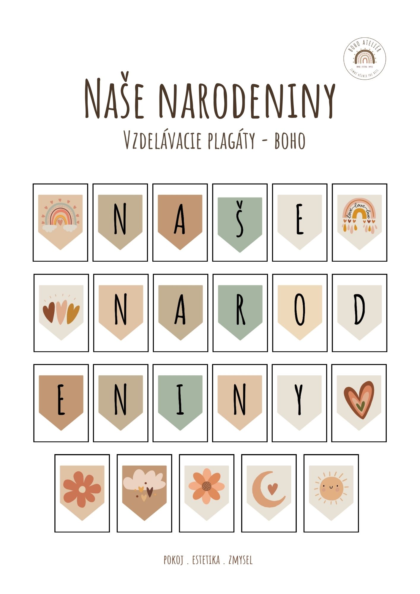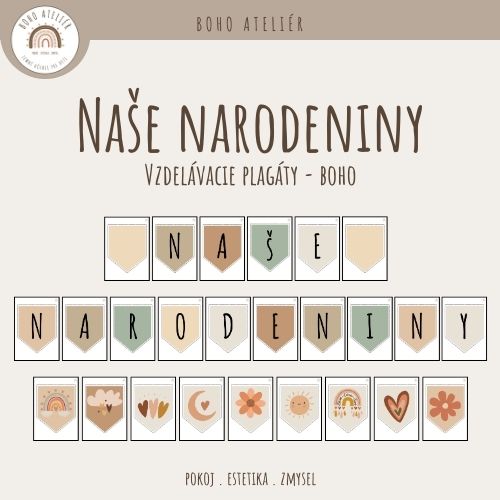 Banner „Naše narodeniny“ v boho štýle je dekoratívny a zároveň edukačný prvok, ktorý v kombinácii s narodeninovníkom slúži na prehľadné zobrazenie narodenín detí v triede. Je vhodný pre materské aj základné školy.