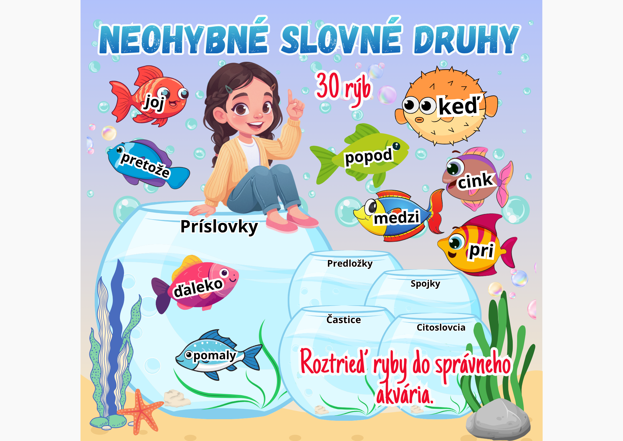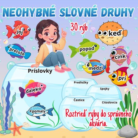 Úlohou žiakov je roztriediť ryby so slovami do správnych akvárií. Súbor obsahuje spolu 30 rýb.