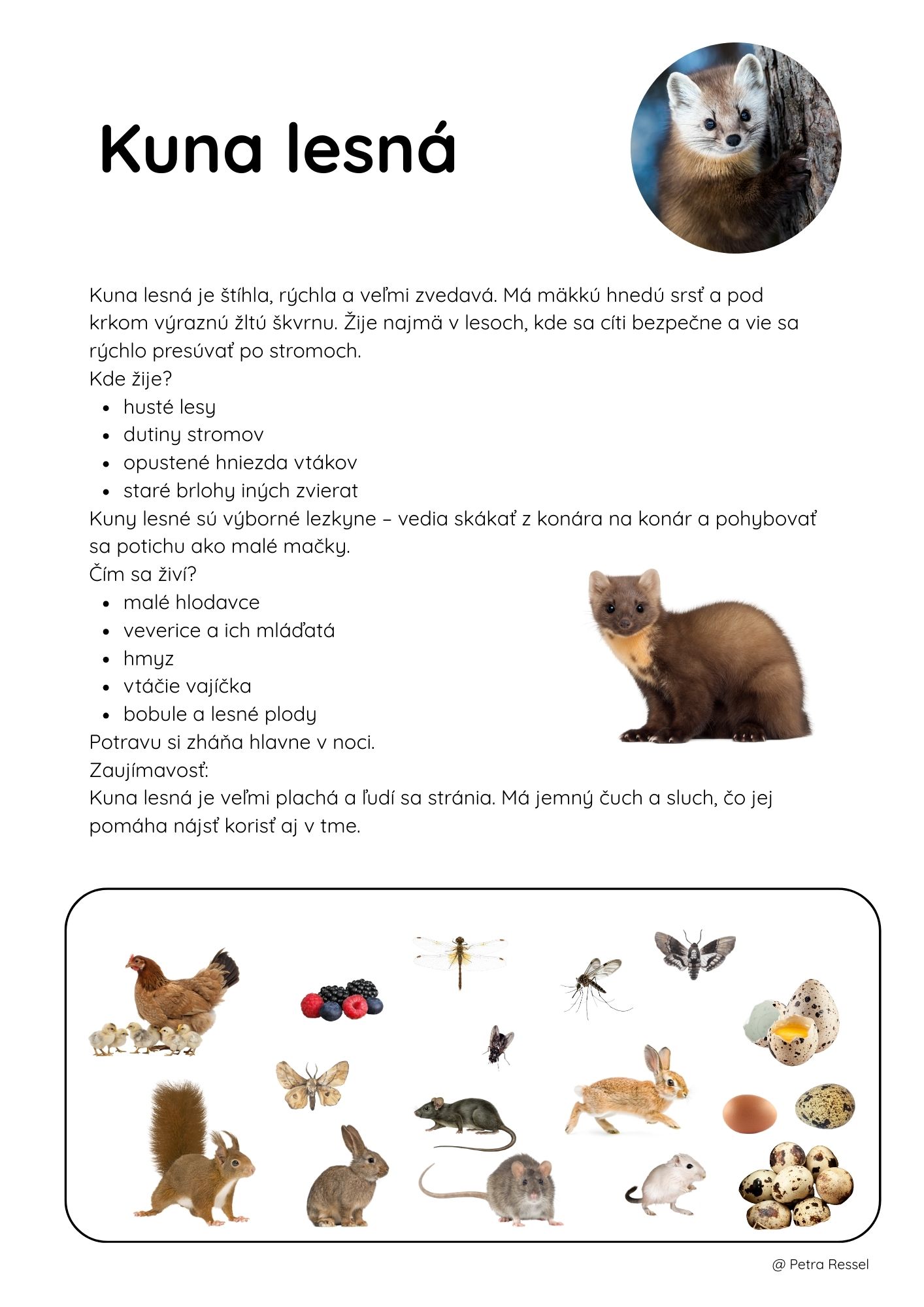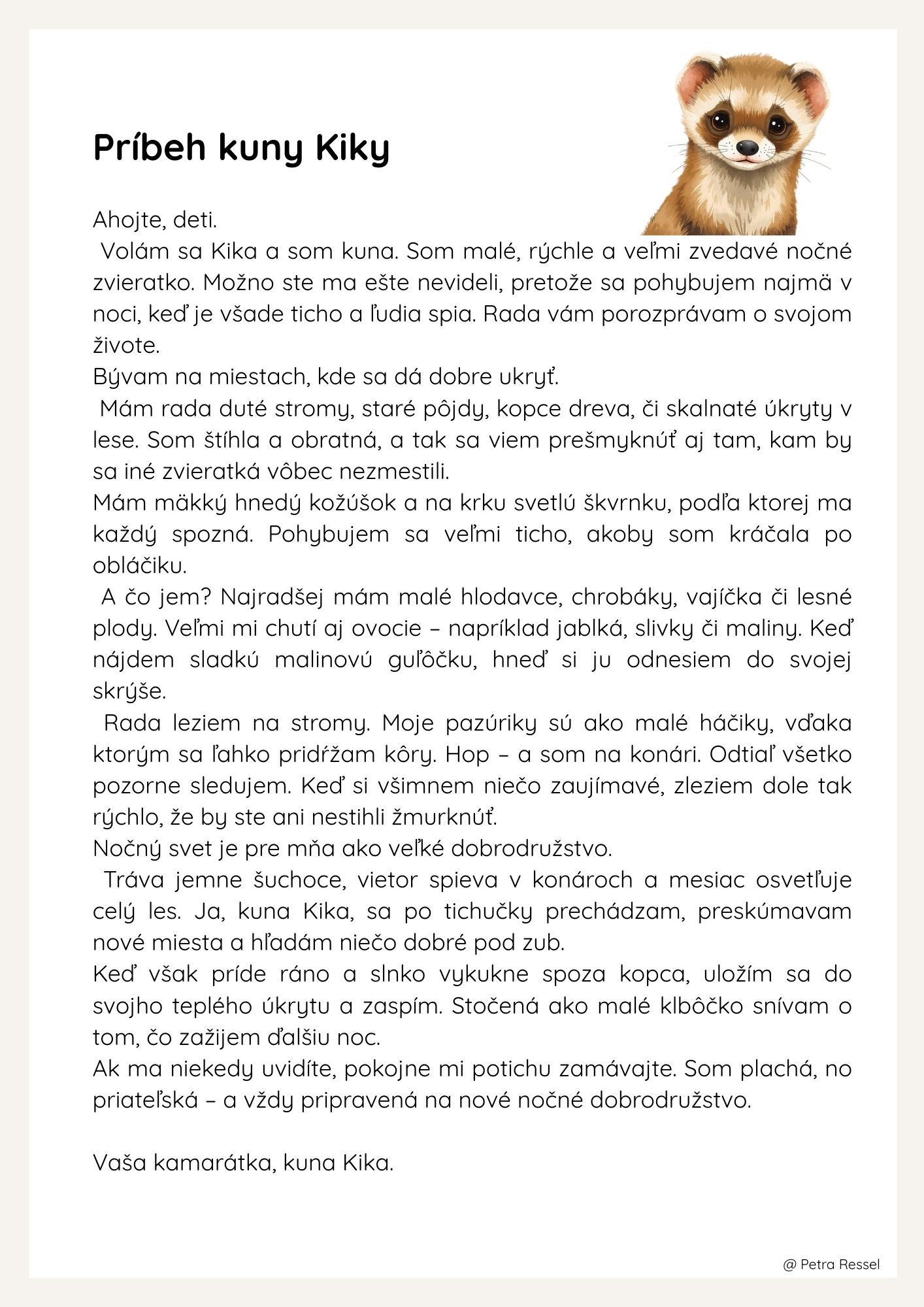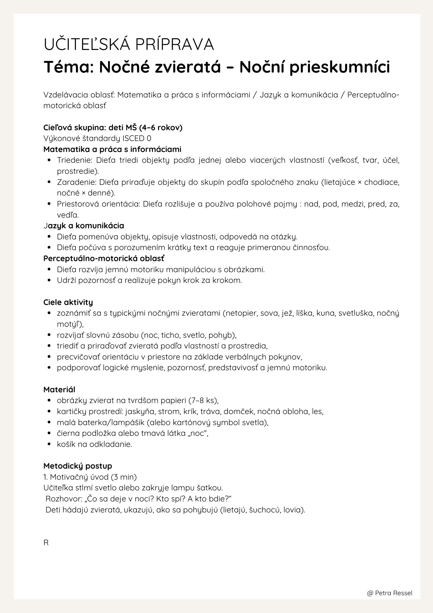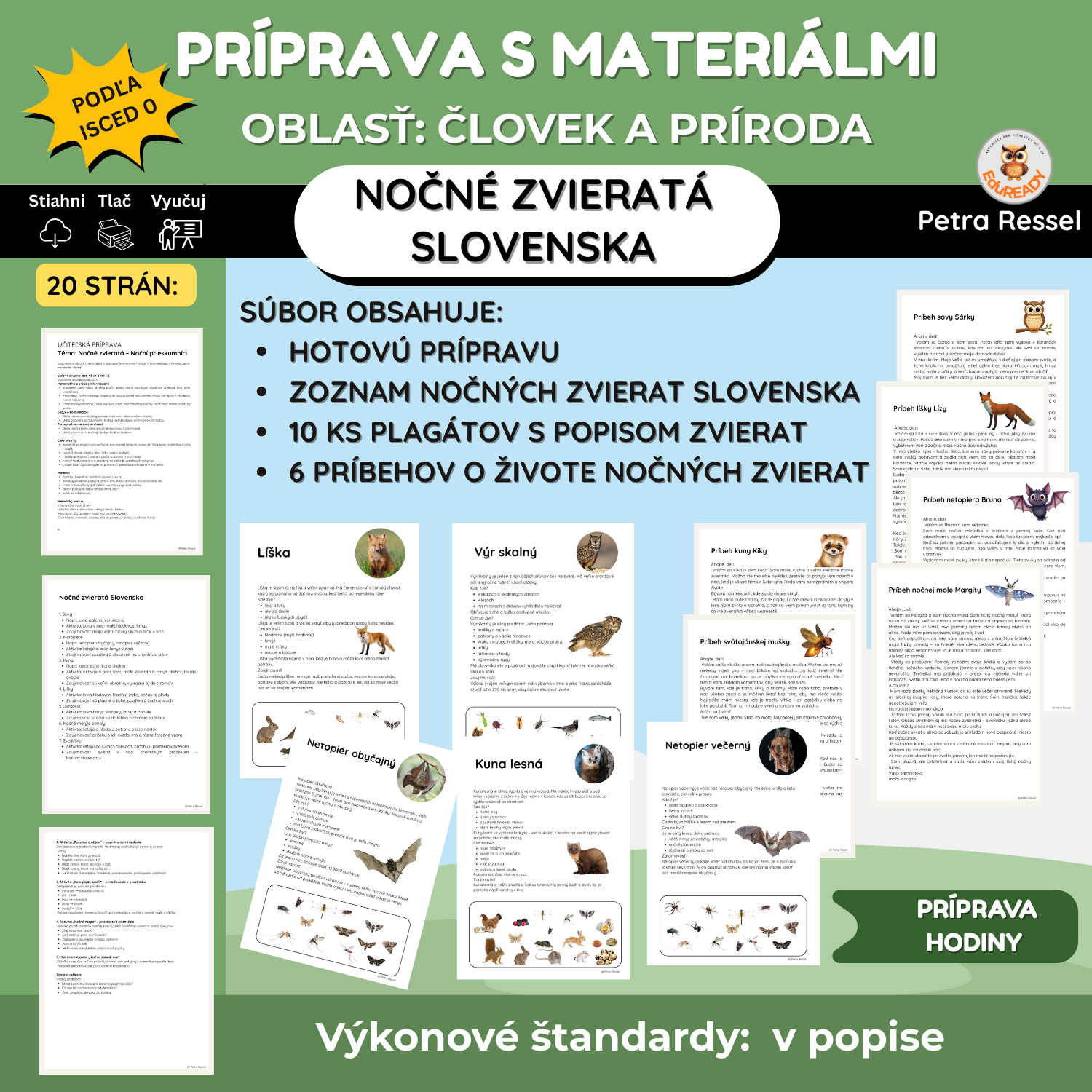 Súbor obsahuje 10 plagátov o nočných zvieratách , 6 príbehov , ktoré deťom o svojom živote rozprávajú zvieratká. Súbor je možné vytlačiť ako brožúrku a používať ako učebnicu - alebo mini-knižku, ak vytlačíte 2 listy na 1 stranu.