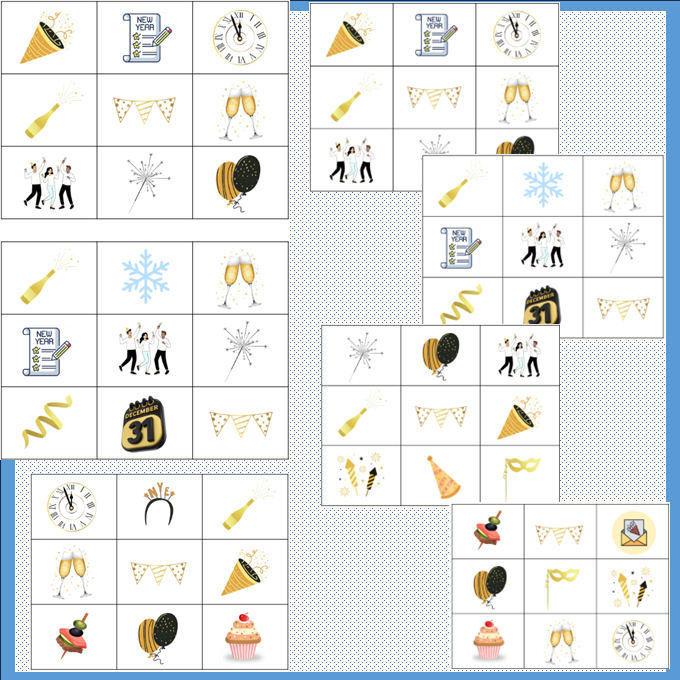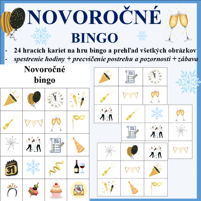 •24 hracích kariet (2 karty na jednom liste) s obrázkami na tému Silvester a Nový rok