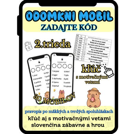 Každý mobil obsahuje 10 slov. Tri/štyri slová sú nesprávne napísané (s chybou). Čísla pri týchto slovách tvoria kód. Čísla žiaci zapíšu v správnom poradí ako 4-miestny kód.