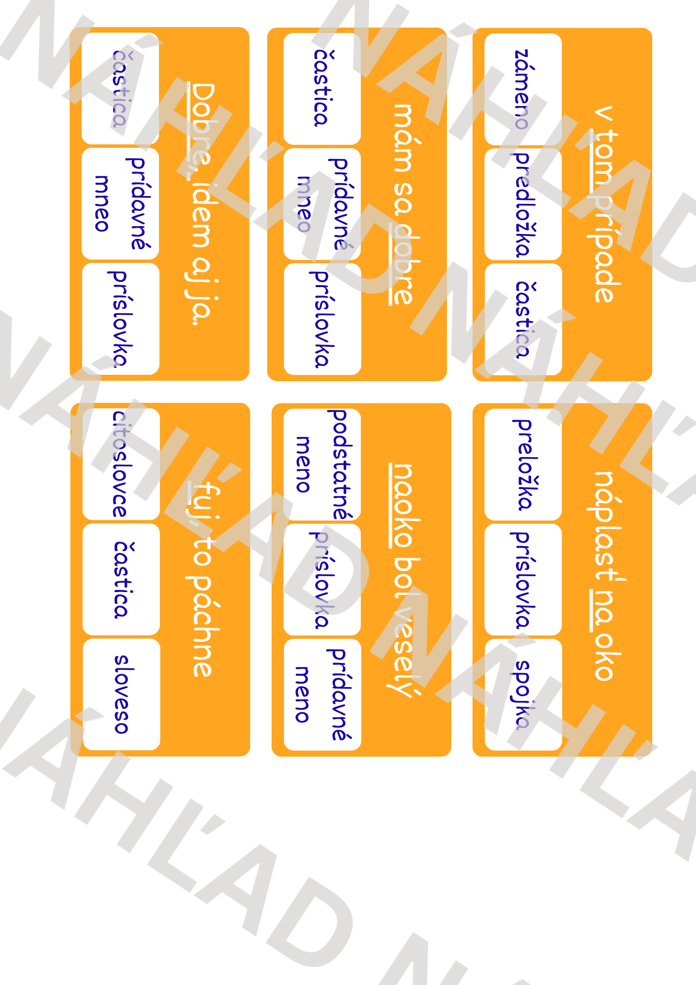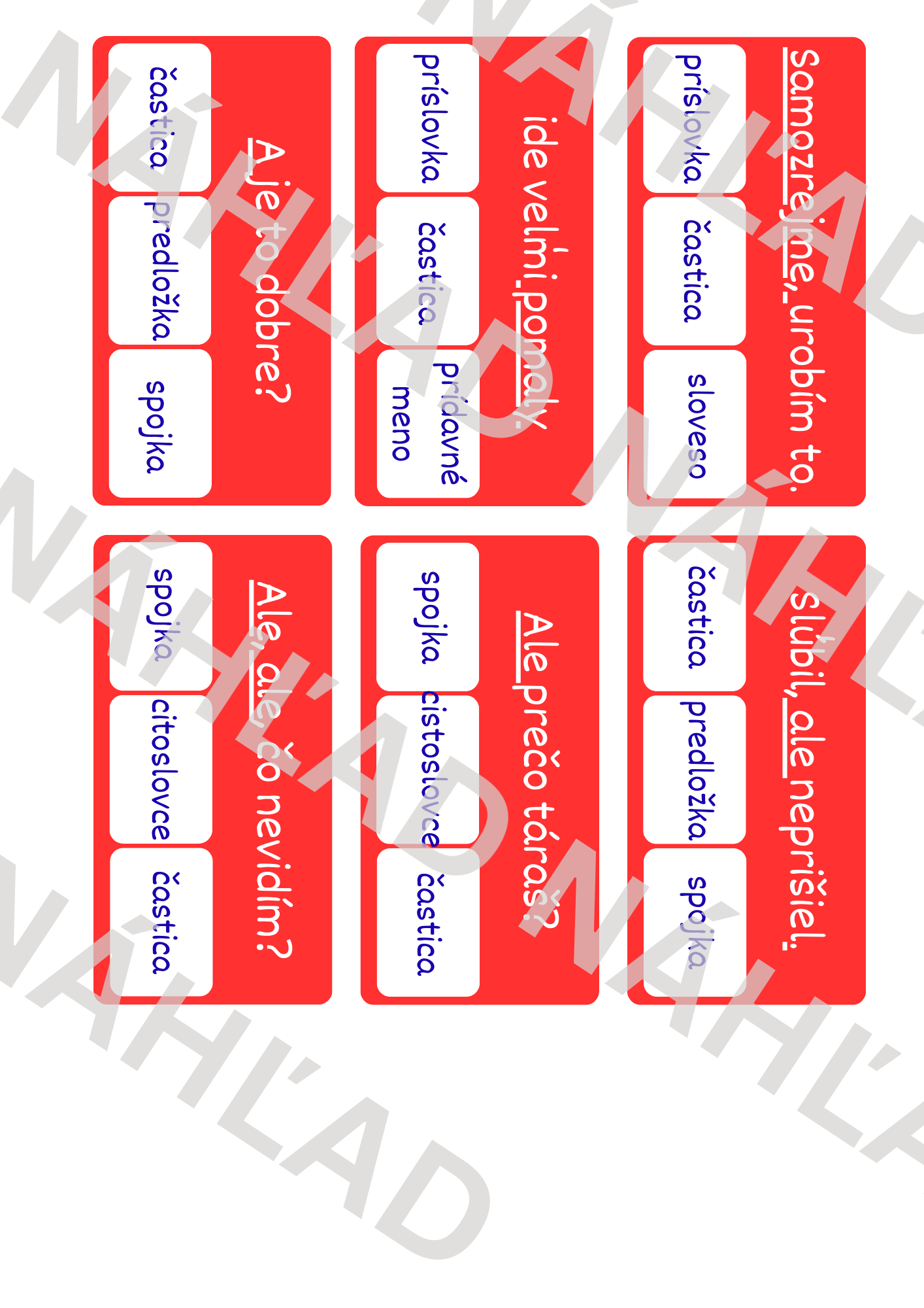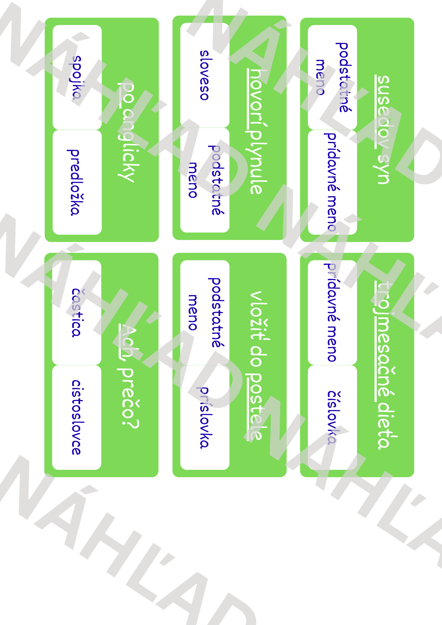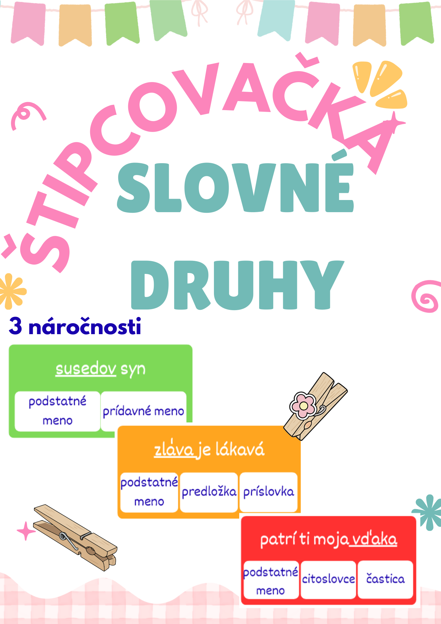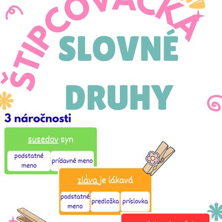 Balík obsahuje 90 kartičiek. Kartičky sú farebne odlíšené. Tieto farby značia náročnosť. Zelené kartičky sú najjednoduchšie, oranžové stredne náročné a červené sú náročné. Hráme vo dvojiciach alebo malých skupinách. Úlohou žiaka, ktorý si kartičku vytiahne, je prištipnúť štipec na slovný druh, ktorý zodpovedá podčiarknutému slovu. Kontrolovať navzájom sa môžu žiaci alebo môžete fixkou dozadu vyznačiť správnu odpoveď a po štipnutí si to takto žiaci skontrolujú s istotou správnosti úplne samostatne. Ja zvyknem po zalaminovaní kartičiek vždy centrofixkou označiť bodkou správnu odpoveď, aby som mala istotu, že bude mať každý žiak či skupina okamžitú možnosť kontroly. Je to veľmi nápomocné najmä pri ťažších slovách.