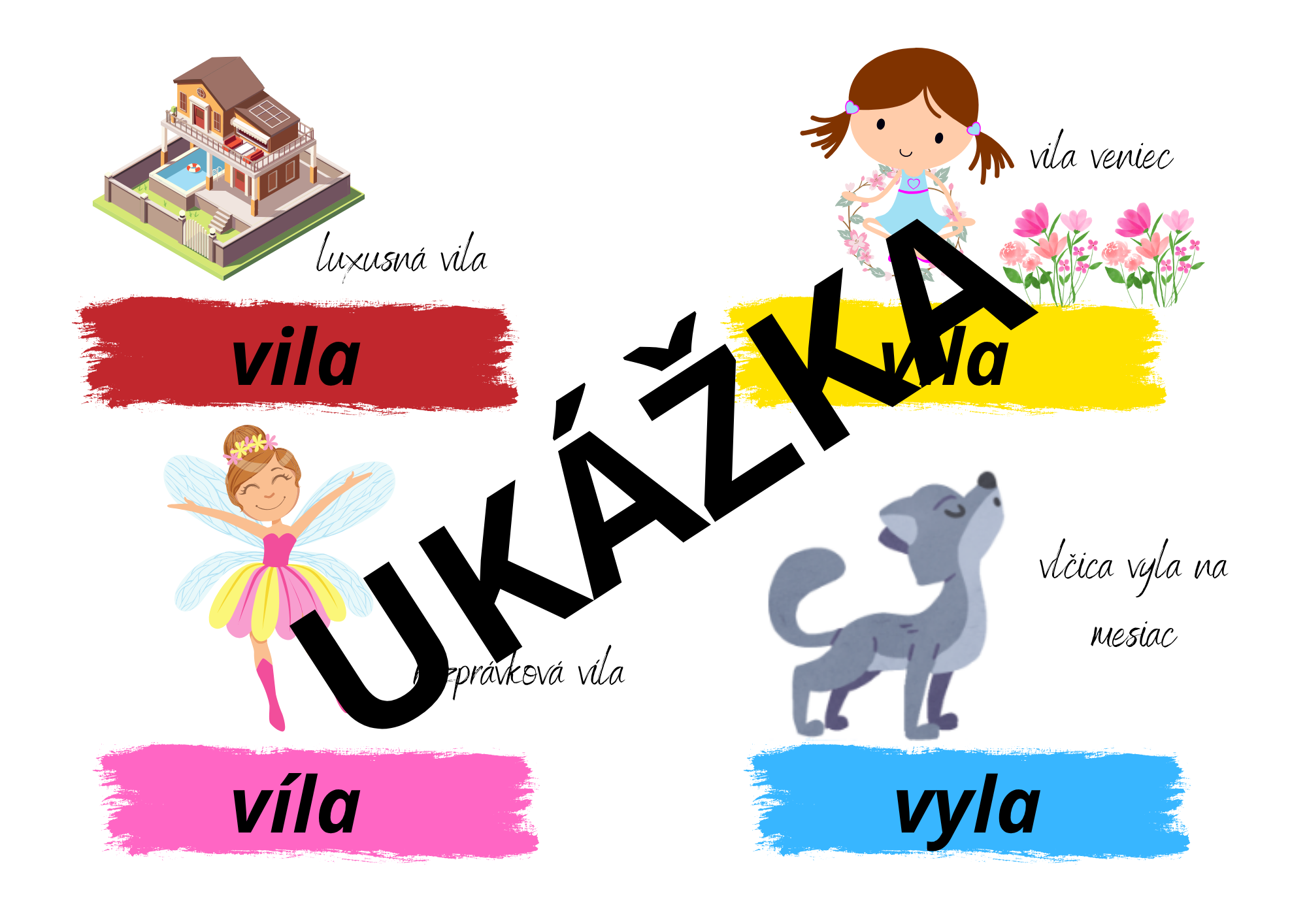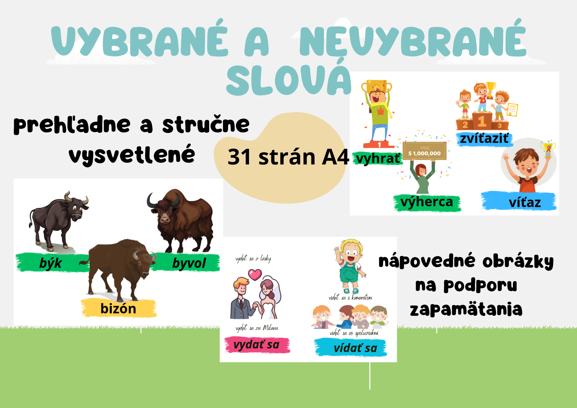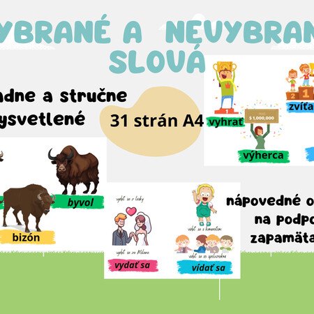 Materiál obsahuje 31 strán A4 s vybranými slovami alebo slovnými spojeniami v kontraste so slovami, ktoré sú im podobné, ale píšu sa inak.