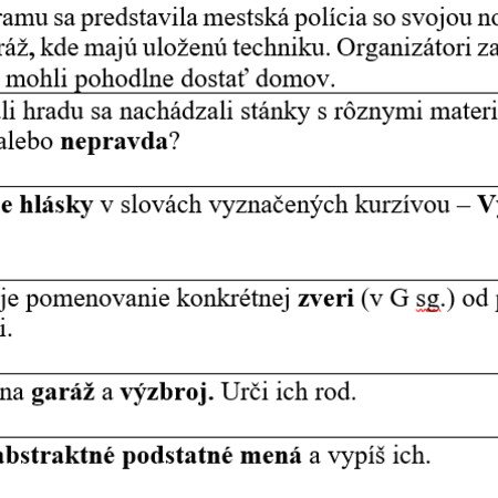 Pracovný list Podstatné mená je určený na precvičovanie učiva zo slovenského jazyka. Obsahuje ukážkový text, z ktorého vychádzajú rôznorodé úlohy: doplňovanie chýbajúcich hlások, určovanie rodu a vzorov podstatných mien, vyhľadávanie abstraktných, hromadných či pomnožných podstatných mien, tvorbu tvarov v pádoch a prácu so slovami cudzieho pôvodu. Súčasťou je aj otázka na porozumenie textu.