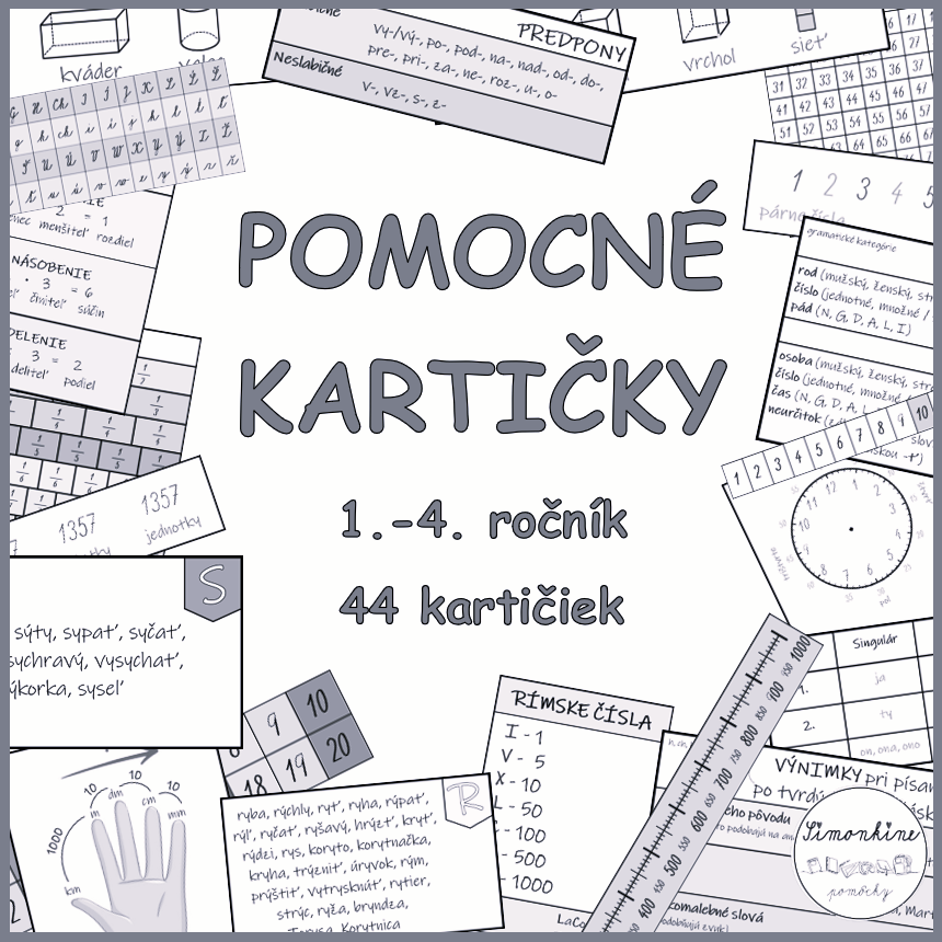 Na výber máte až 44 pomocných kartičiek pre 1. – 4. ročník. Vytlačte si tie, ktoré práve potrebujete. Vytvorte si v triede „košík PRVEJ POMOCI“. Mať možnosť používať kartičku dáva deťom pocit istoty a podpory, že je v poriadku prijať, či požiadať o pomoc aj v podobe takejto kartičky.