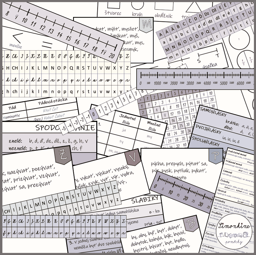 stovková tabuľka, číselná os do 20, násobilková tabuľka, zlomky - pásik, zlomky - kruh, hodiny, premeny jednotiek dĺžky, pádové otázky, osoba + číslo (verzia jednotné, množné/singulár, plurál), počtové operácie, bod, úsečka, priamka..., rovinné geometrické útvary, priestorové geometrické útvary, kocka, jednotky, desiatky..., porovnávanie, párcne/nepárne čísla, rímske čísla, delenie hlások, spodobovanie, slabiky, predpony, gramatické kategórie (podstatné mená, prídavné mená, slovesá), vybrané slová po b, m, p, r, s, v, z, výnimky pri písaní "i" po tvrdých spoluhláskach, písaná abeceda (krátka), tlačená abeceda (krátka), písaná + tlačená abeceda(krátka), písaná abeceda (dlhá), tlačená abeceda (dlhá), číselna os od -5 do 15, číselná os do 20, číselná os do 100, číselná os do 1000, číselná os do 10000, slovné druhy.