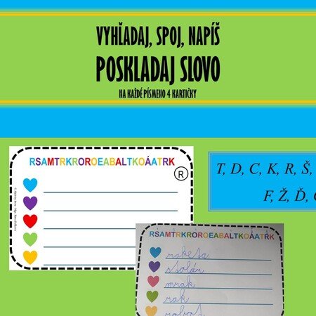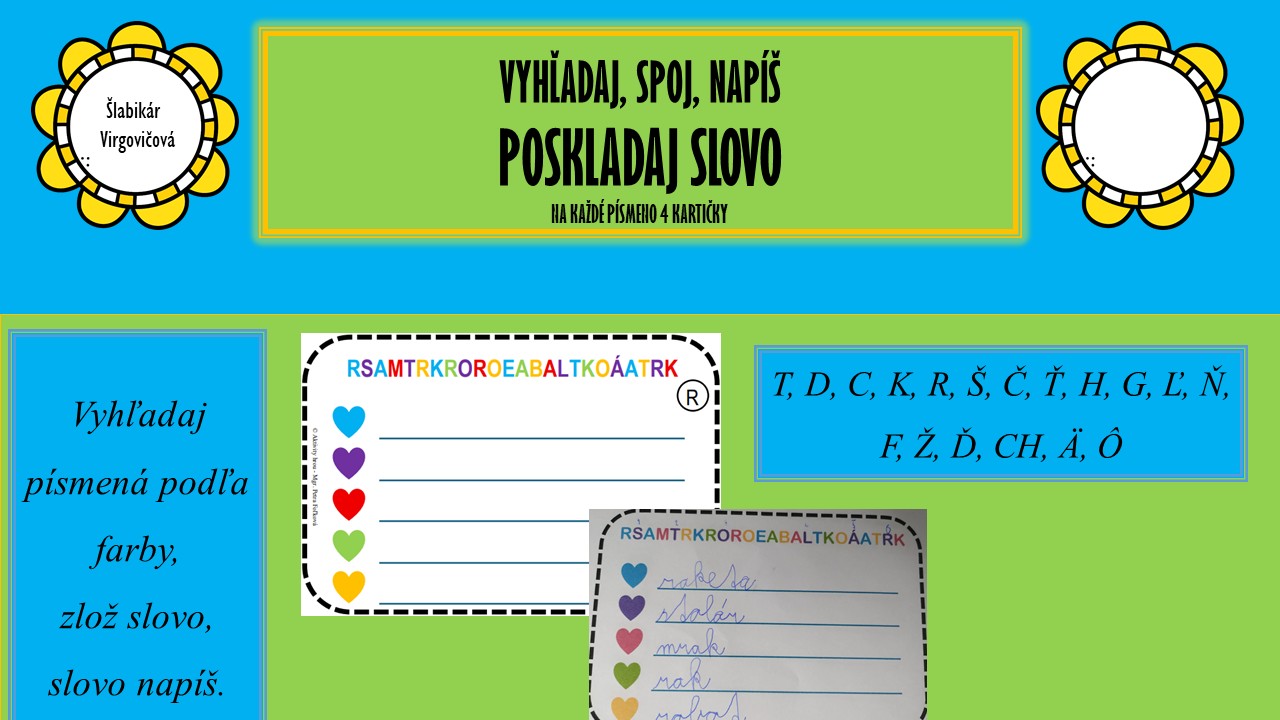 - žiaci podľa farieb na kartičke skladajú slovo z písmen