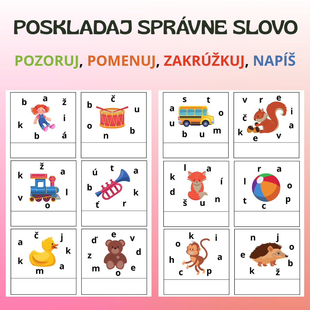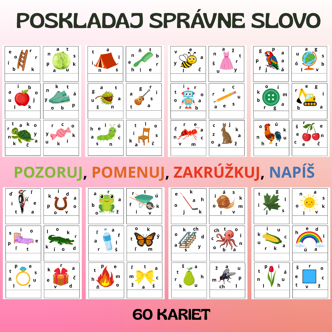 Na každej kartičke sa nachádza obrázok. Úlohou žiaka je pomenovať obrázok, z písmen poskladať pomenované slovo a napísať ho na čiaru pod obrázkom. Písmen okolo obrázka je viacero, nie len tie, z ktorých je slovo zložené - je to tak preto, aby to pre žiaka nebolo príliš jednoduché a trochu potrápil hlavičku.