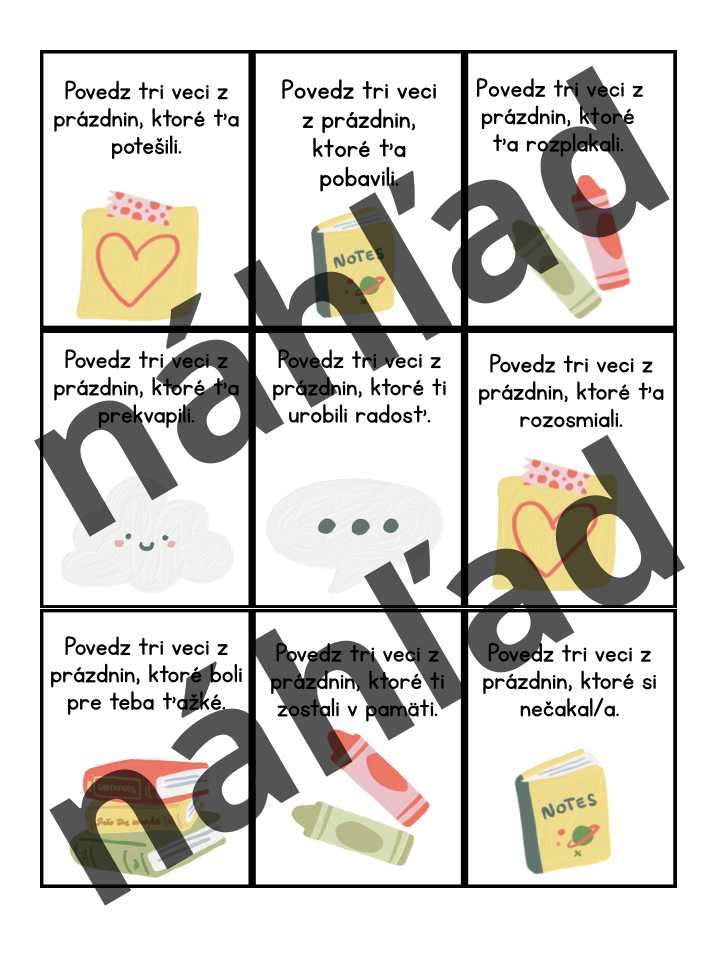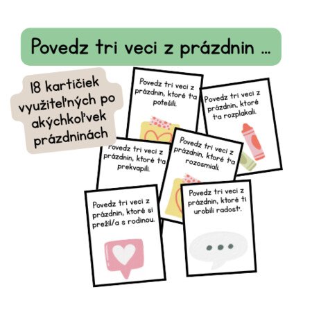 Materiál „Povedz tri veci z prázdnin…“ obsahuje 18 komunikačných kartičiek, ktoré pomáhajú deťom prirodzene rozprávať o svojich zážitkoch, pocitoch a skúsenostiach. Kartičky sú navrhnuté tak, aby boli univerzálne a použiteľné po akýchkoľvek prázdninách alebo voľných dňoch počas celého školského roka.