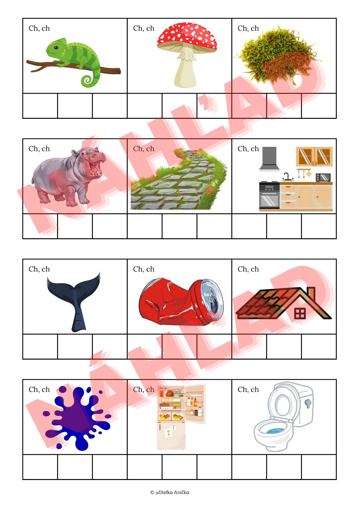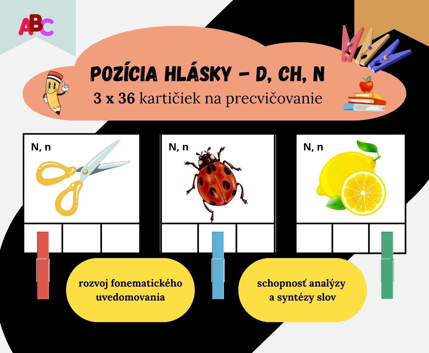 Sada 3 x 36 kartičiek, ktorá je zameraná na určovanie pozície hlásky v slove (na začiatku, v strede, na konci slova). Materiál je pripravený tak, aby bol pre deti prehľadný, hravý a ľahko použiteľný počas vyučovania alebo v rámci individuálnej práce.