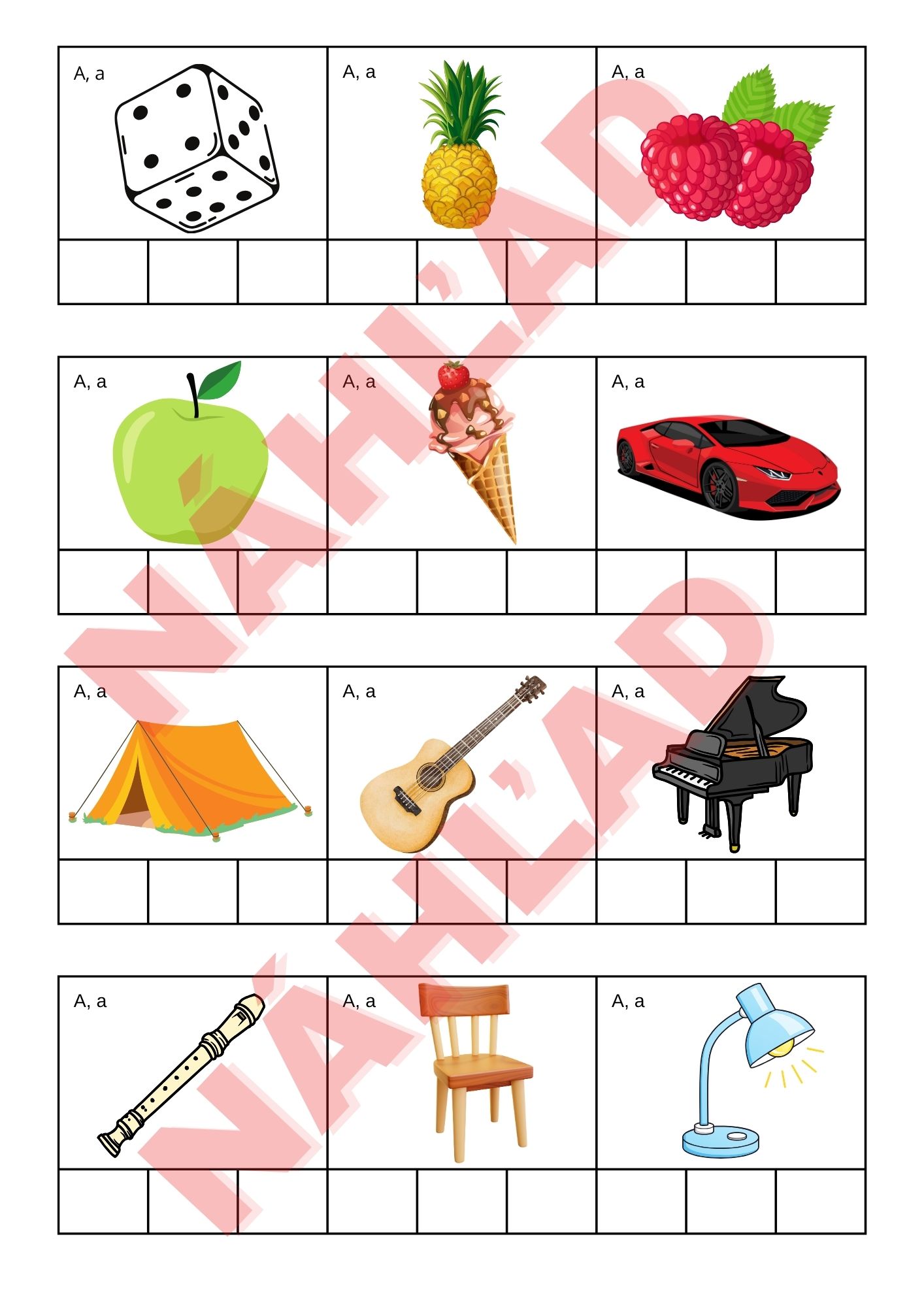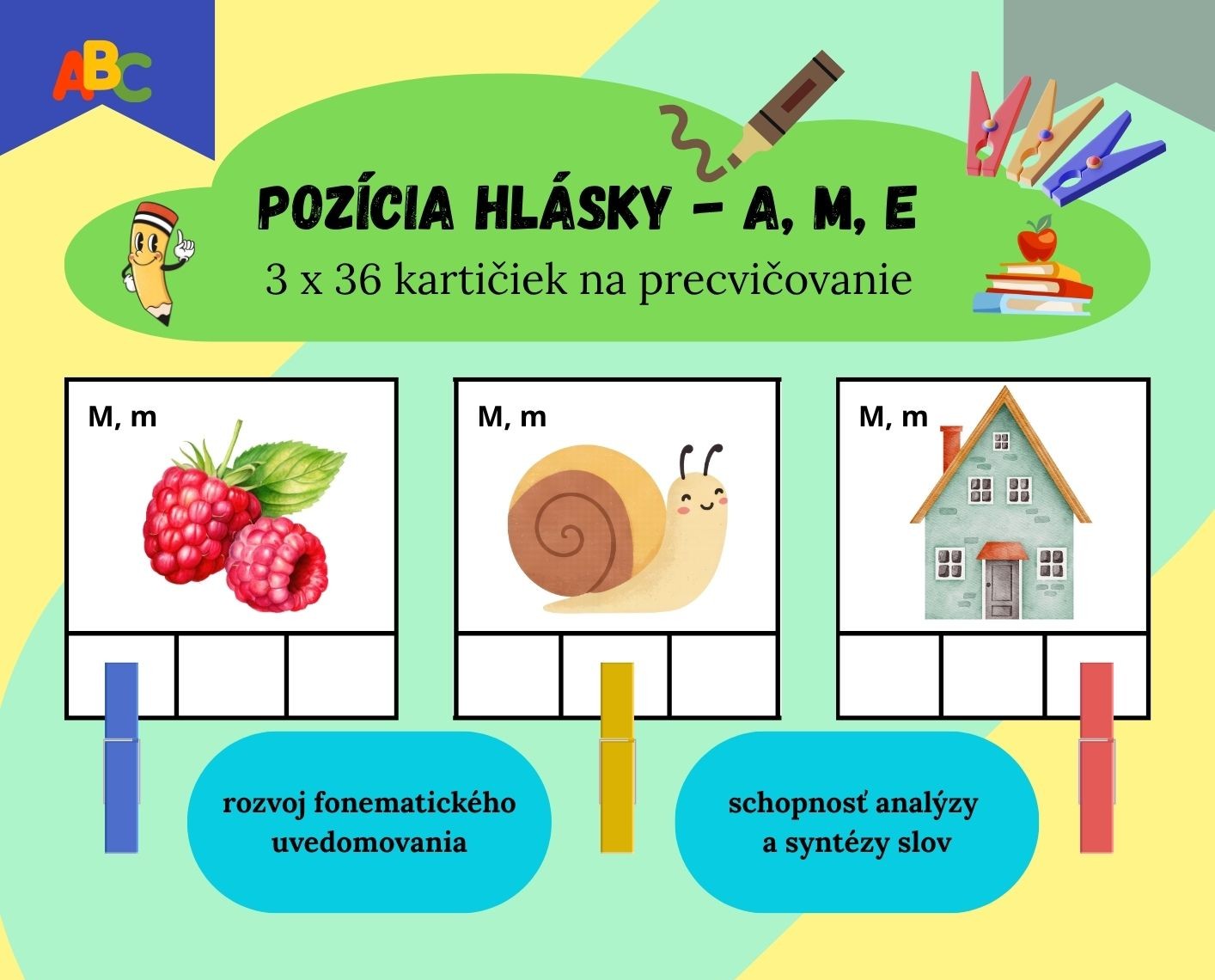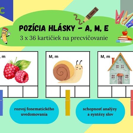 Sada 3 x 36 kartičiek, ktorá je zameraná na určovanie pozície hlásky v slove (na začiatku, v strede, na konci slova). Materiál je pripravený tak, aby bol pre deti prehľadný, hravý a ľahko použiteľný počas vyučovania alebo v rámci individuálnej práce.