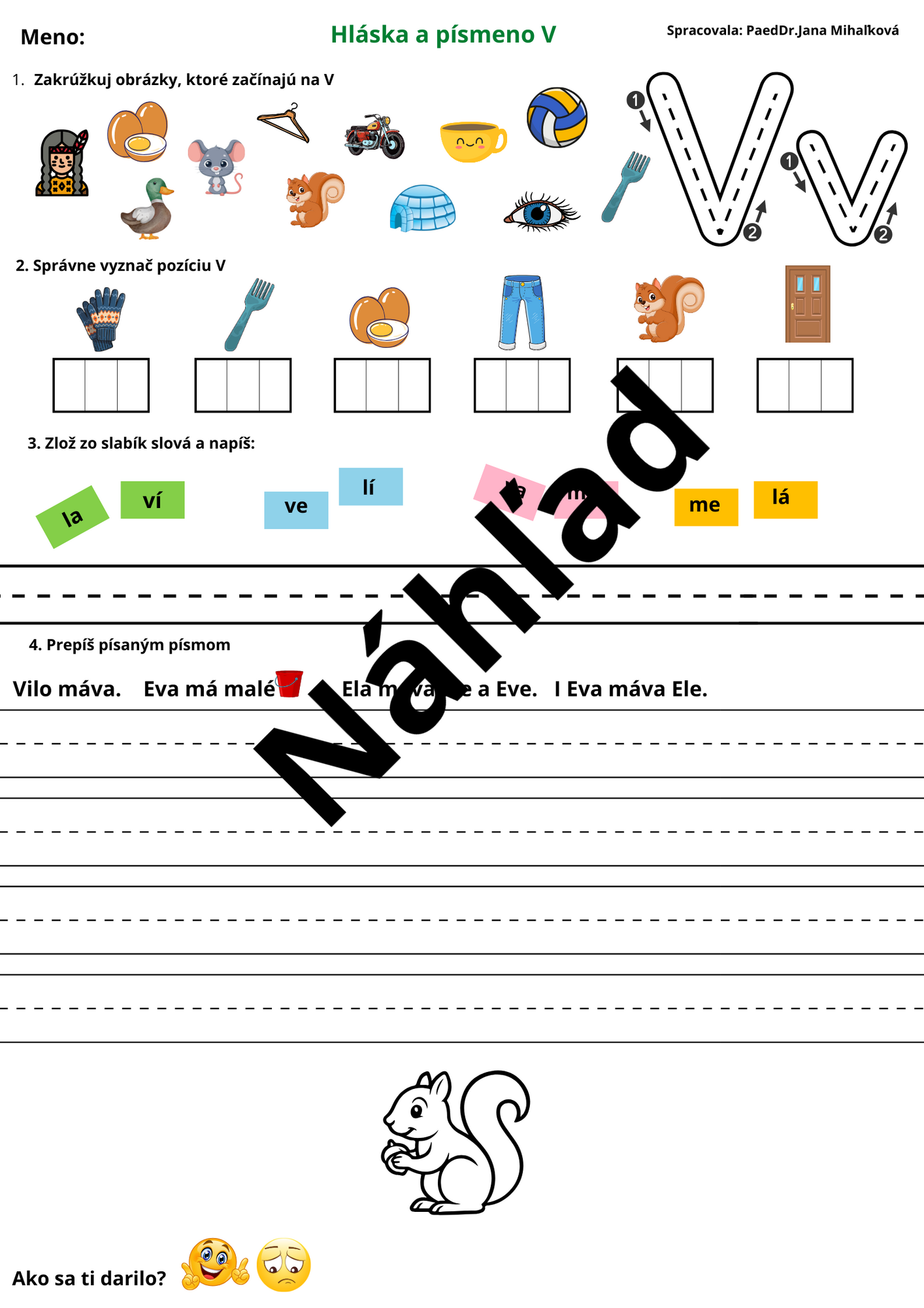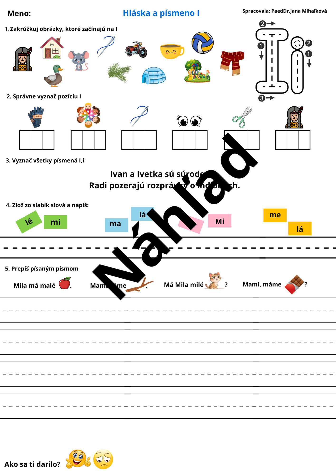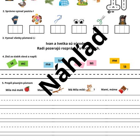 Súbor obsahuje pracovné listy, ktoré sú spracované k šlabikáru Lipka. Je k dispozícii pracovný list k písmenu A, M, E, L, I, V , U, O, J. V prílohe je aj pracovný list, ktorý používam na precvičovanie písania. Rovnako sú k dispozícii dva pracovné listy, ktoré môžu slúžiť ako písomná práca. Pracovné listy sú vytvárané tak, aby sa zvyšovala aj náročnosť čo sa týka počtu úloh a náročnosti.
