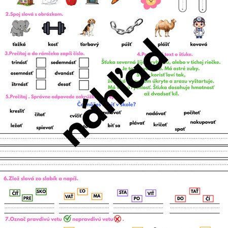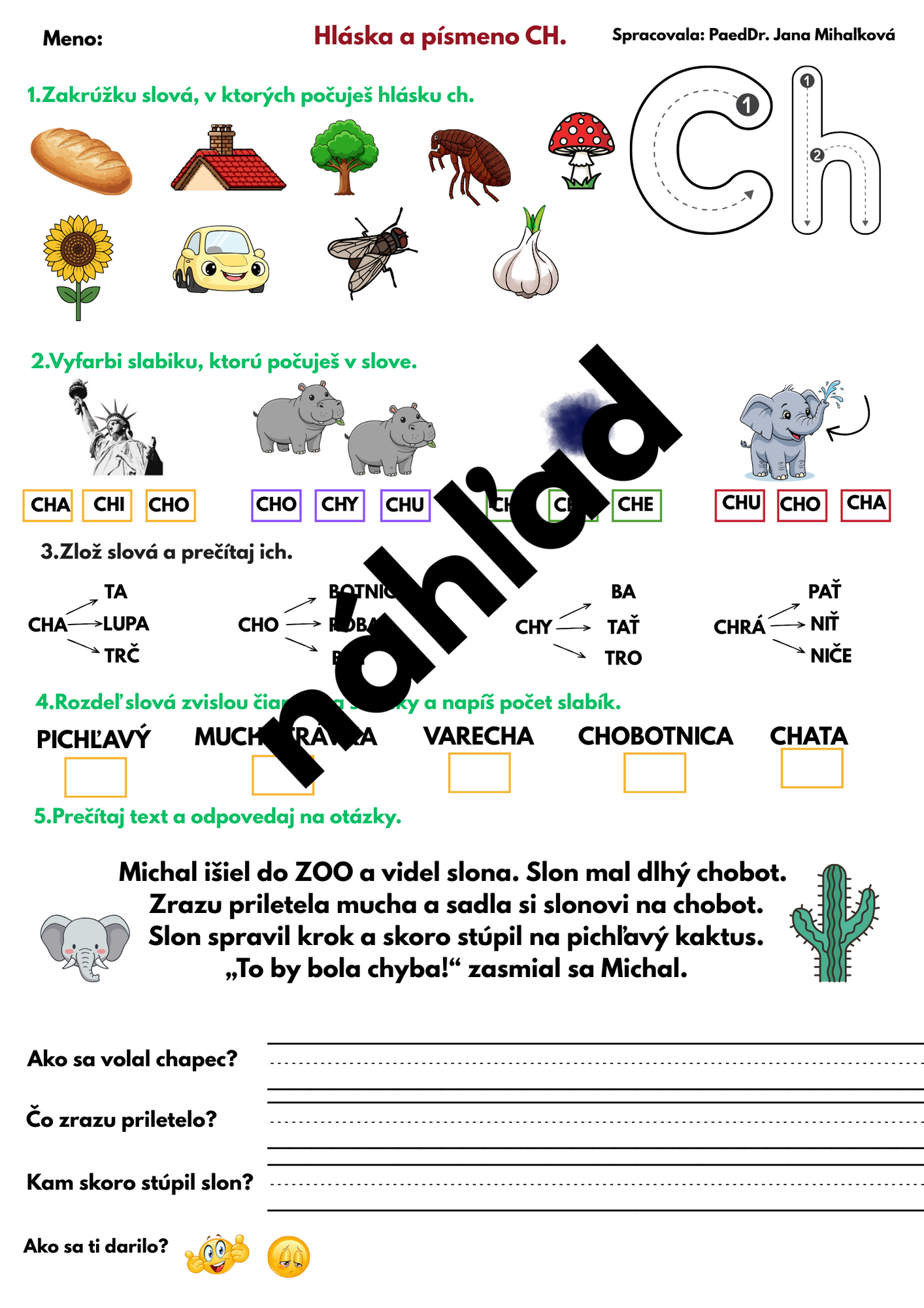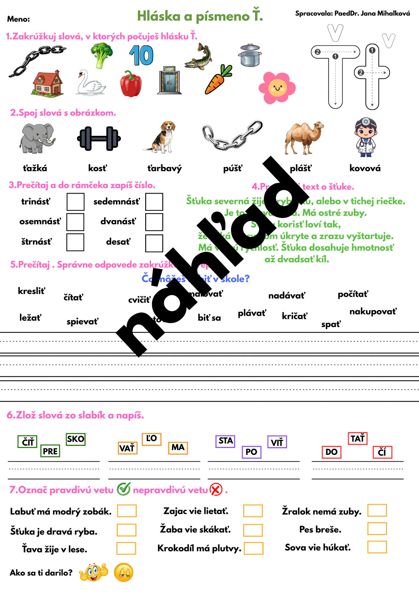 Pracovné listy sú vhodné pre prvý ročník so zameraním na precvičovanie a upevňovanie písmen: Ť, Ň, Ď, CH, (DE,TE,NE,LE,DI,TI,NI,LI), dvojhlásky IA, IE, IU. Typy úloh sa opakujú tak, aby ich deti vedeli vypracovať aj samostatne po prečítaní zadania učiteľom. Súčasťou je aj obodovaná písomná práca. Nechýbajú ani lákavé farebné obrázky, ktoré deti veľmi obľubujú. Odporúčam vytlačiť pracovný list farebne.