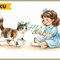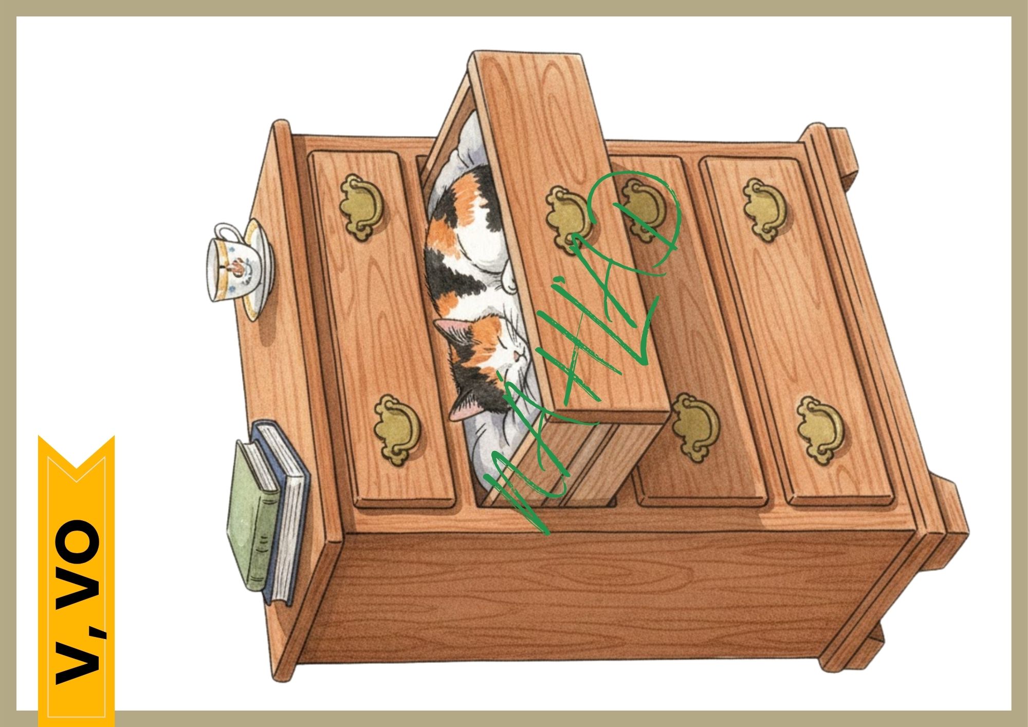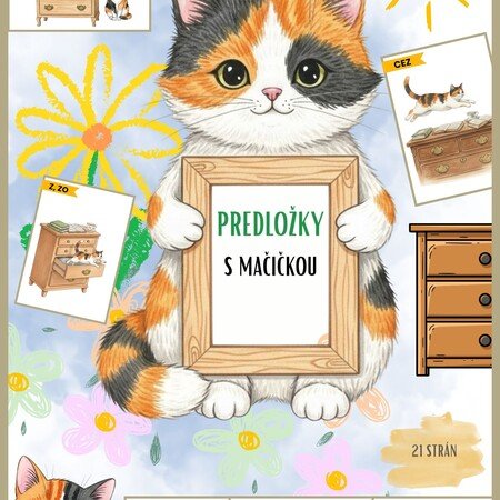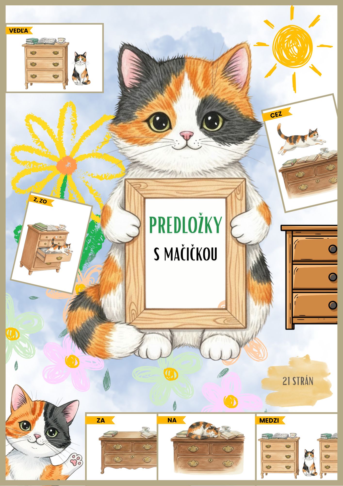 - Séria ilustrácií mačky v rôznych situáciách, ktoré znázorňujú základné predložky: