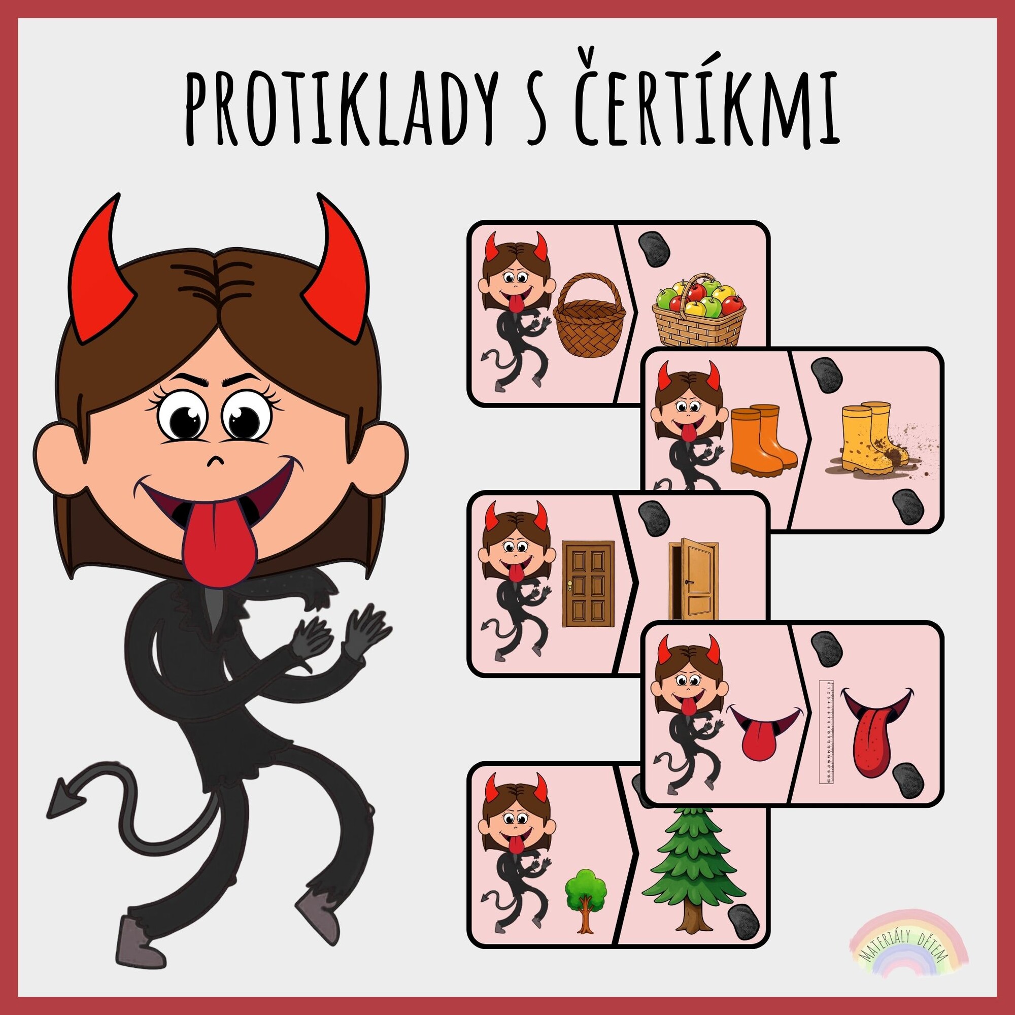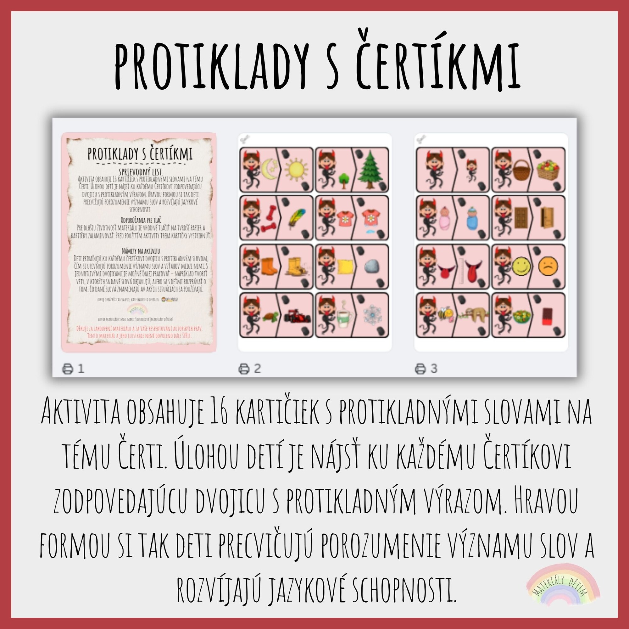 Aktivita obsahuje 16 kartičiek s protikladnými slovami na tému Čerti. Úlohou detí je nájsť ku každému Čertíkovi zodpovedajúcu dvojicu s protikladným výrazom. Hravou formou si tak deti precvičujú porozumenie významu slov a rozvíjajú jazykové schopnosti.