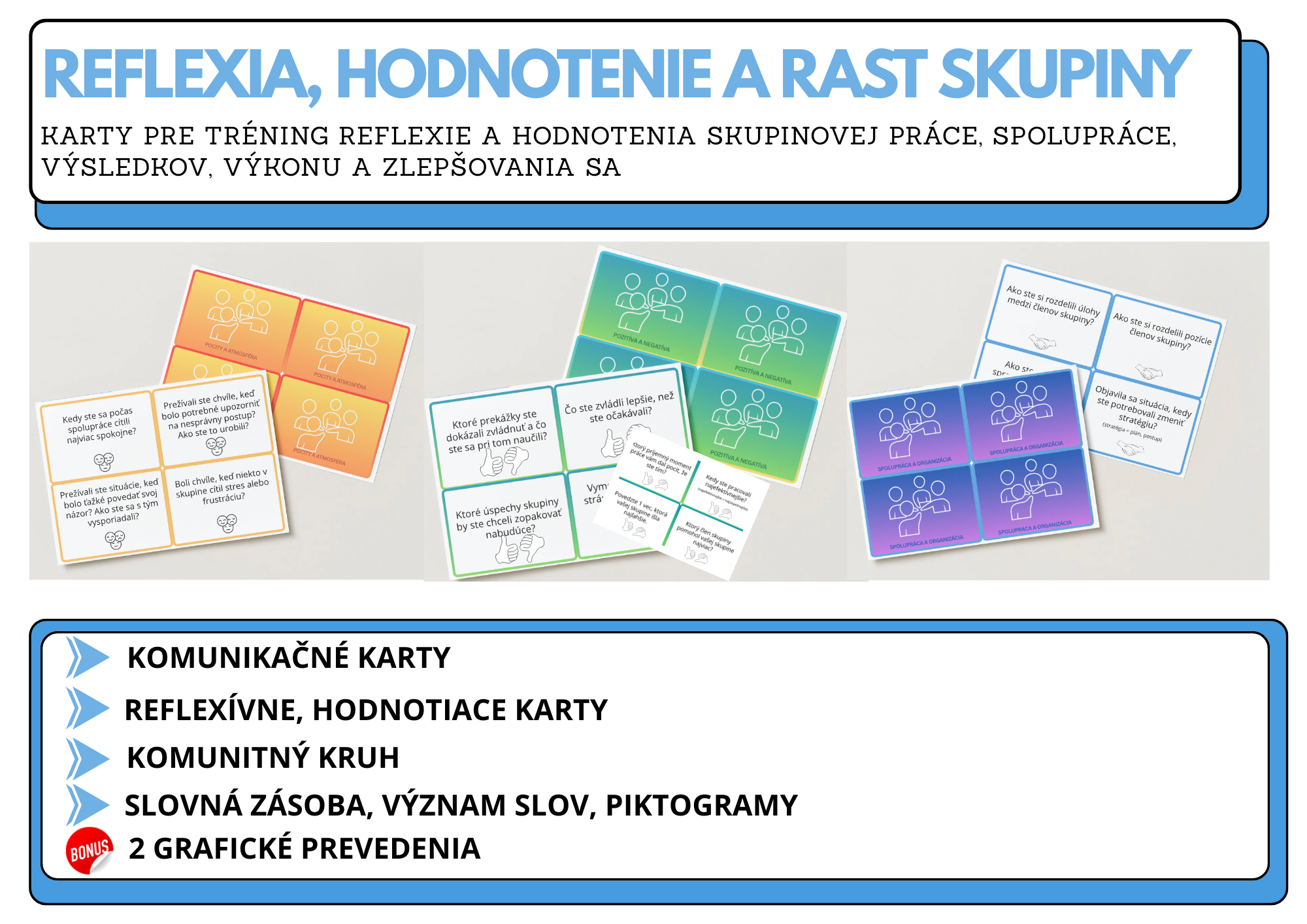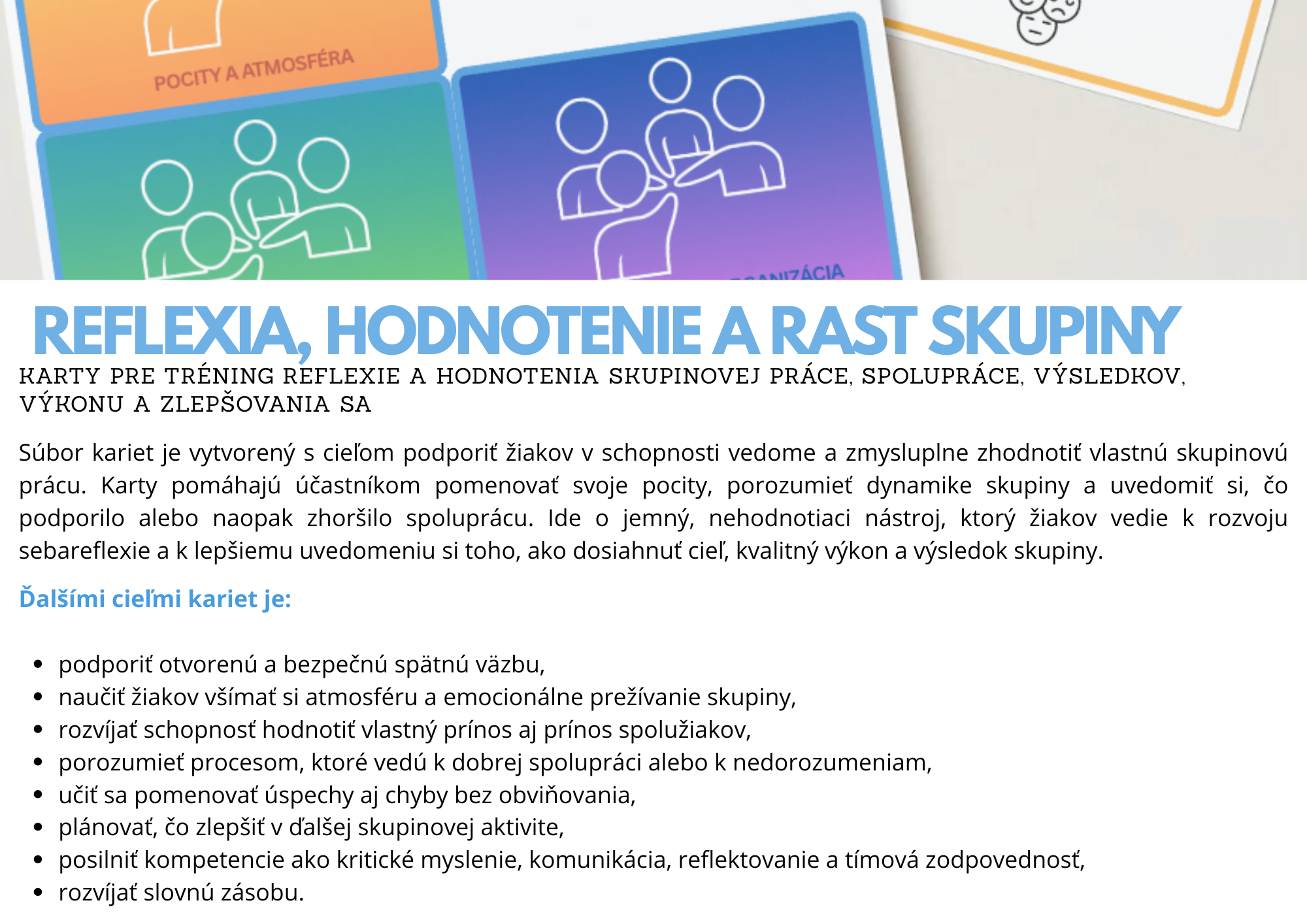 Súbor kariet je vytvorený s cieľom podporiť žiakov v schopnosti vedome a zmysluplne zhodnotiť vlastnú skupinovú prácu. Karty pomáhajú účastníkom pomenovať svoje pocity, porozumieť dynamike skupiny a uvedomiť si, čo podporilo alebo naopak zhoršilo spoluprácu. Ide o jemný, nehodnotiaci nástroj, ktorý žiakov vedie k rozvoju sebareflexie a k lepšiemu uvedomeniu si toho, ako dosiahnuť cieľ, kvalitný výkon a výsledok skupiny.