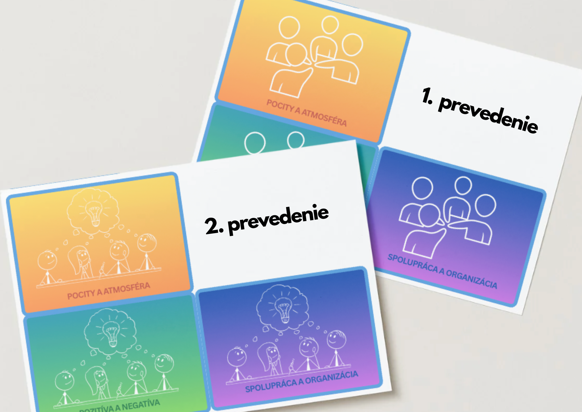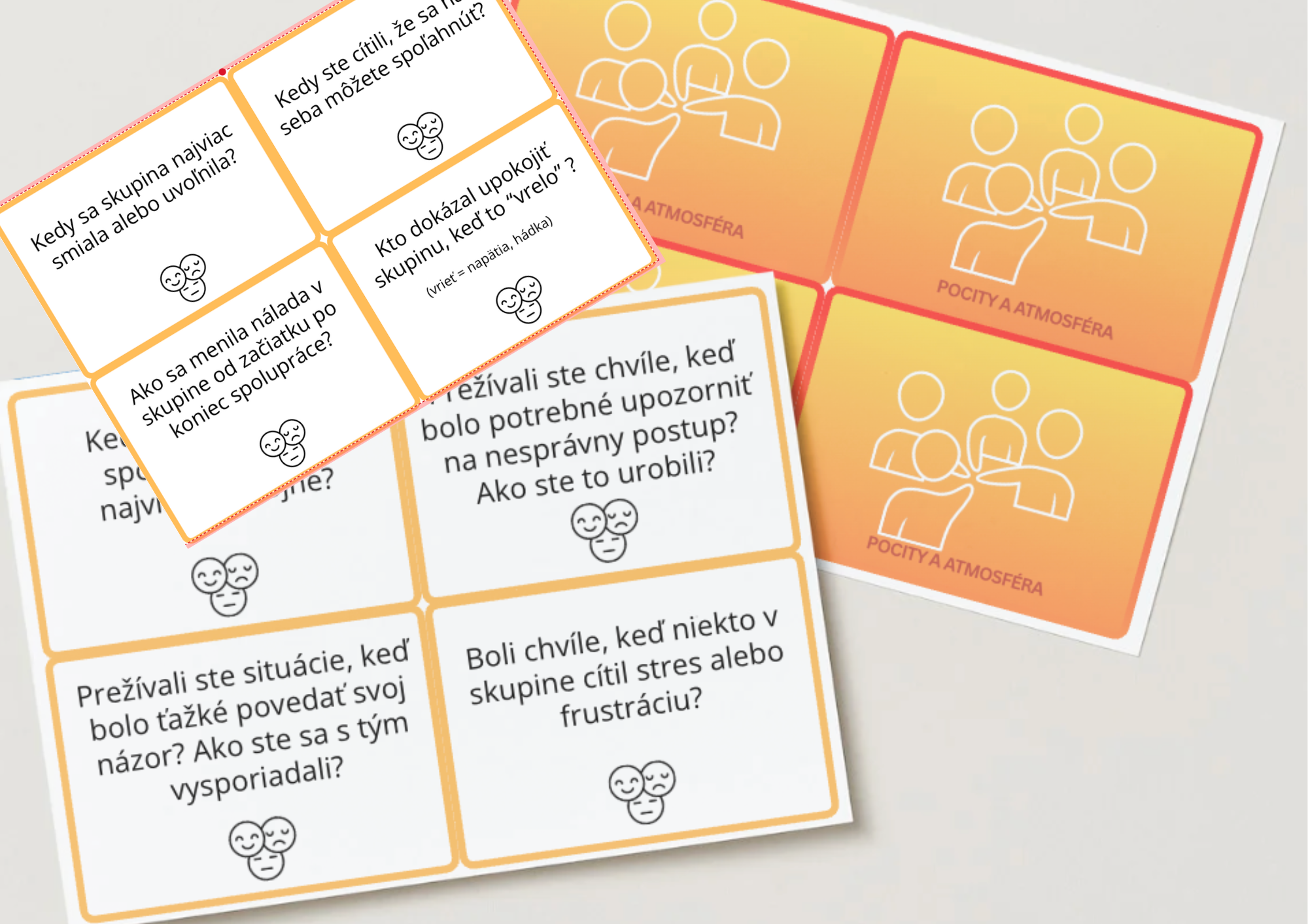 1. Pocity a atmosféra (žltá sada) - sada vedie žiakov k tomu, aby pomenovali, ako sa počas spolupráce cítili, čo vytváralo podporujúcu atmosféru a čo naopak spôsobovalo napätie alebo nejasnosť. Pomáha uvedomiť si, aký vplyv majú emócie, nálada a komunikácia na celkový priebeh skupinovej práce.