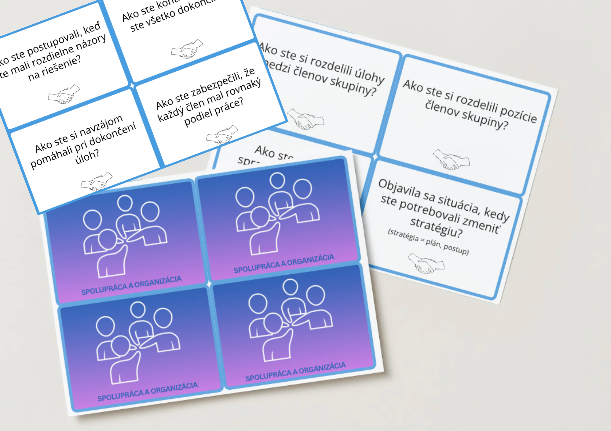 2. Spolupráca a organizácia (modrá sada) - otázky v tejto sade smerujú k hodnoteniu toho, ako tím plánoval, organizoval a koordinoval jednotlivé kroky. Žiaci premýšľajú nad tým, ako si delili úlohy, ako komunikovali, čo fungovalo dobre a ktoré stratégie by v budúcnosti chceli zlepšiť.