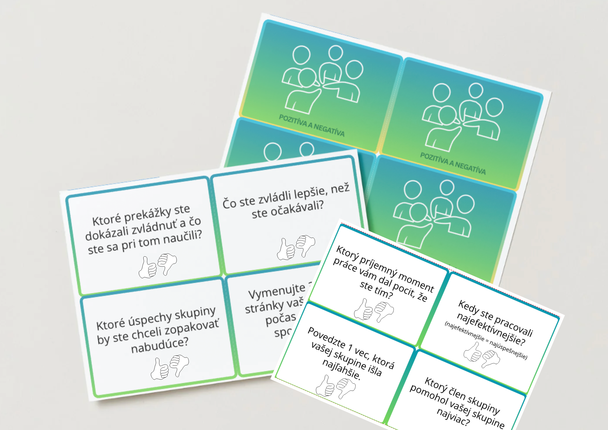 3. Pozitíva a negatíva (zelená sada) - sada pomáha pomenovať silné momenty, ktoré prispeli k úspešnému výsledku, aj oblasti, ktoré nefungovali podľa očakávaní. Žiaci sa učia konštruktívne pomenovať, čo sa dá nabudúce urobiť inak, a zároveň vidieť to, čo sa podarilo.
