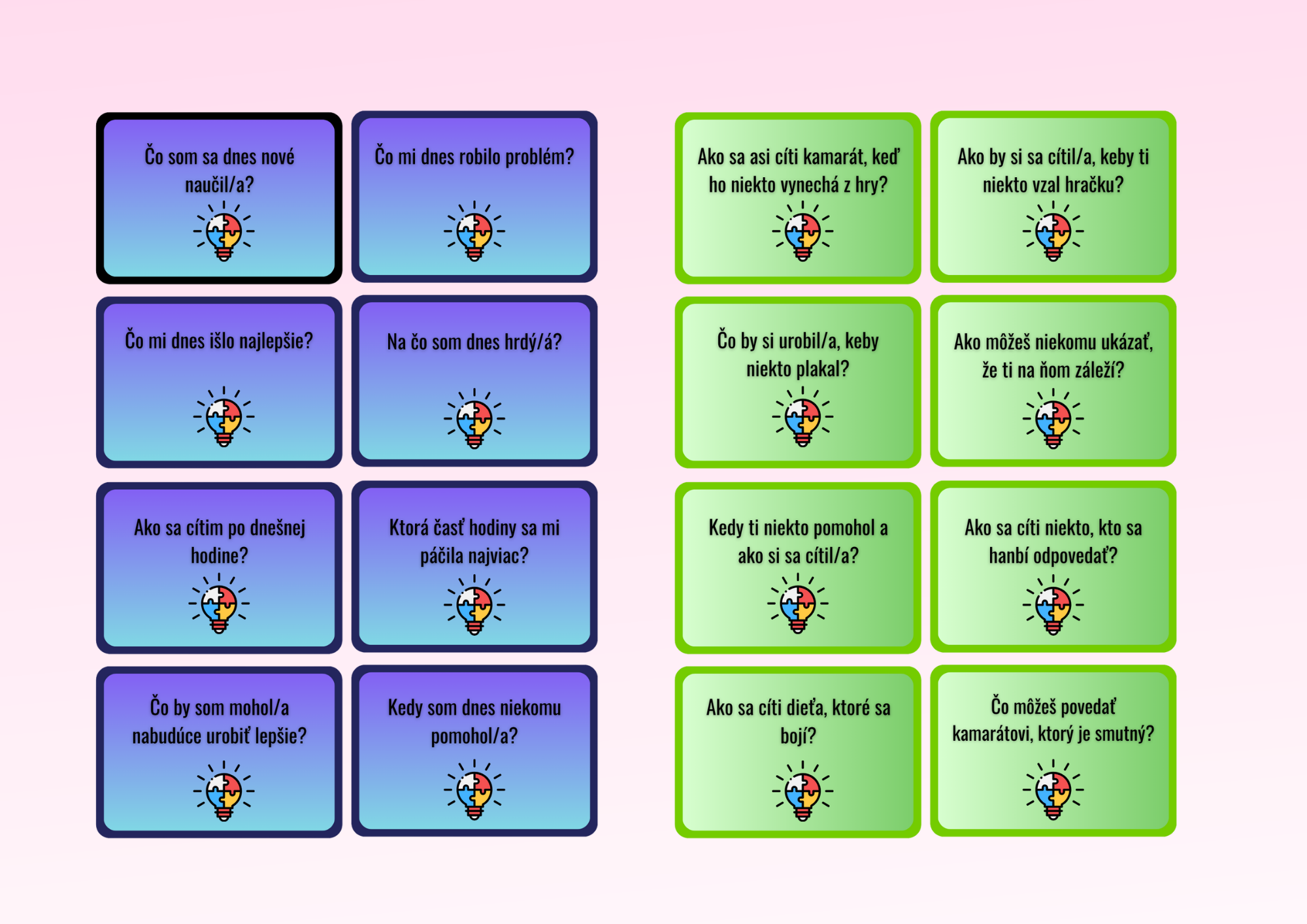 Deti sa zamýšľajú nad tým, ako by sa cítil niekto iný v určitej situácii, učia sa vnímať rôzne pohľady a reagovať s porozumením. Vhodné pri rozhovoroch o priateľstve, konfliktoch či odlišnostiach medzi ľuďmi.
