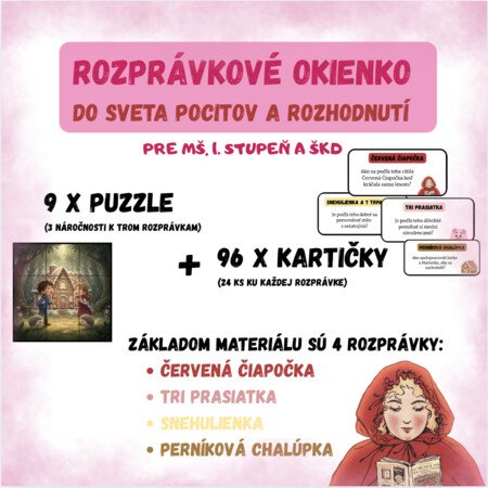 Materiál obsahuje: Puzzle k trom rozprávkam (3 úrovne náročnosti, dokopy 9ks) + 24 reflexívnych kartičiek s otázkami ku každej rozprávke (dokopy 96 kartičiek).