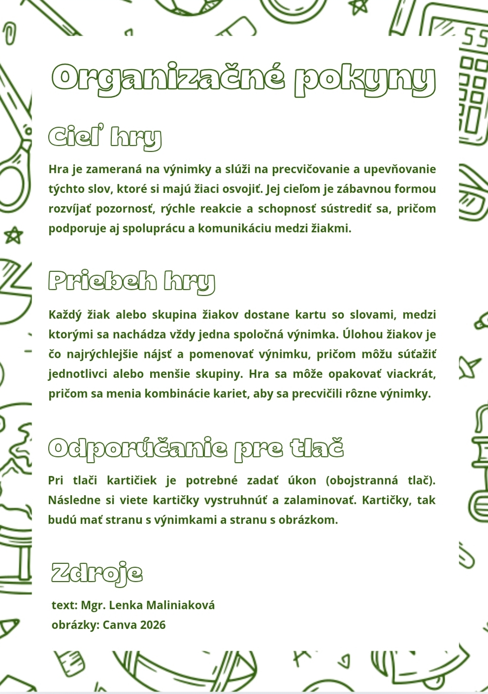 Hra je zameraná na výnimky (D, N, CH). Slúži na precvičovanie a upevňovanie týchto slov, ktoré si majú žiaci osvojiť. Jej cieľom je zábavnou formou rozvíjať pozornosť, rýchle reakcie a schopnosť sústrediť sa, pričom podporuje aj spoluprácu a komunikáciu medzi žiakmi.
