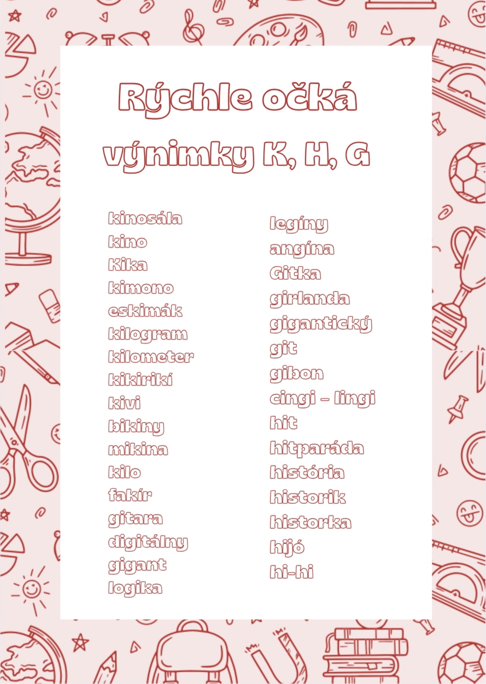 Hra je zameraná na výnimky (K, H, G). Slúži na precvičovanie a upevňovanie týchto slov, ktoré si majú žiaci osvojiť. Jej cieľom je zábavnou formou rozvíjať pozornosť, rýchle reakcie a schopnosť sústrediť sa, pričom podporuje aj spoluprácu a komunikáciu medzi žiakmi.