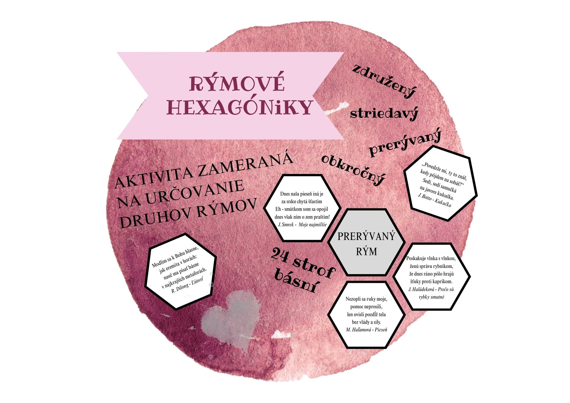 Aktivita je zameraná na určovanie druhov rýmov (striedavý, združený, obkročný, prerývaný). Súbor obsahuje 28 hexagónových kartičiek - na 4 sú názvy rýmu a na 24 sú strofy rôznych básní. Úlohou žiakov je poskladať