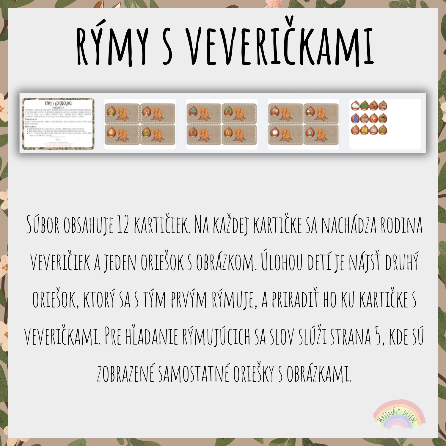 Súbor obsahuje 12 kartičiek. Na každej kartičke sa nachádza rodina veveričiek a jeden oriešok s obrázkom. Úlohou detí je nájsť druhý oriešok, ktorý sa s tým prvým rýmuje, a priradiť ho ku kartičke s veveričkami. Pre hľadanie rýmujúcich sa slov slúži strana 5, kde sú zobrazené samostatné oriešky s obrázkami. Aktivita podporuje fonematické uvedomovanie (vnímanie nádchy), rozvoj slovnej zásoby, zrakového vnímania a schopnosti sústredenia.
