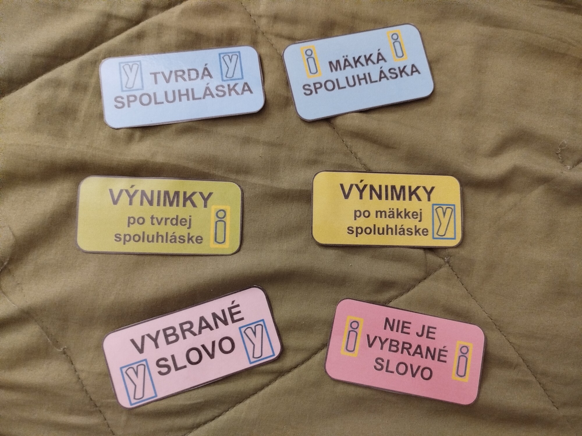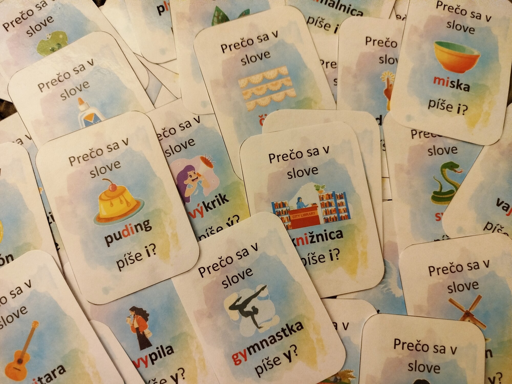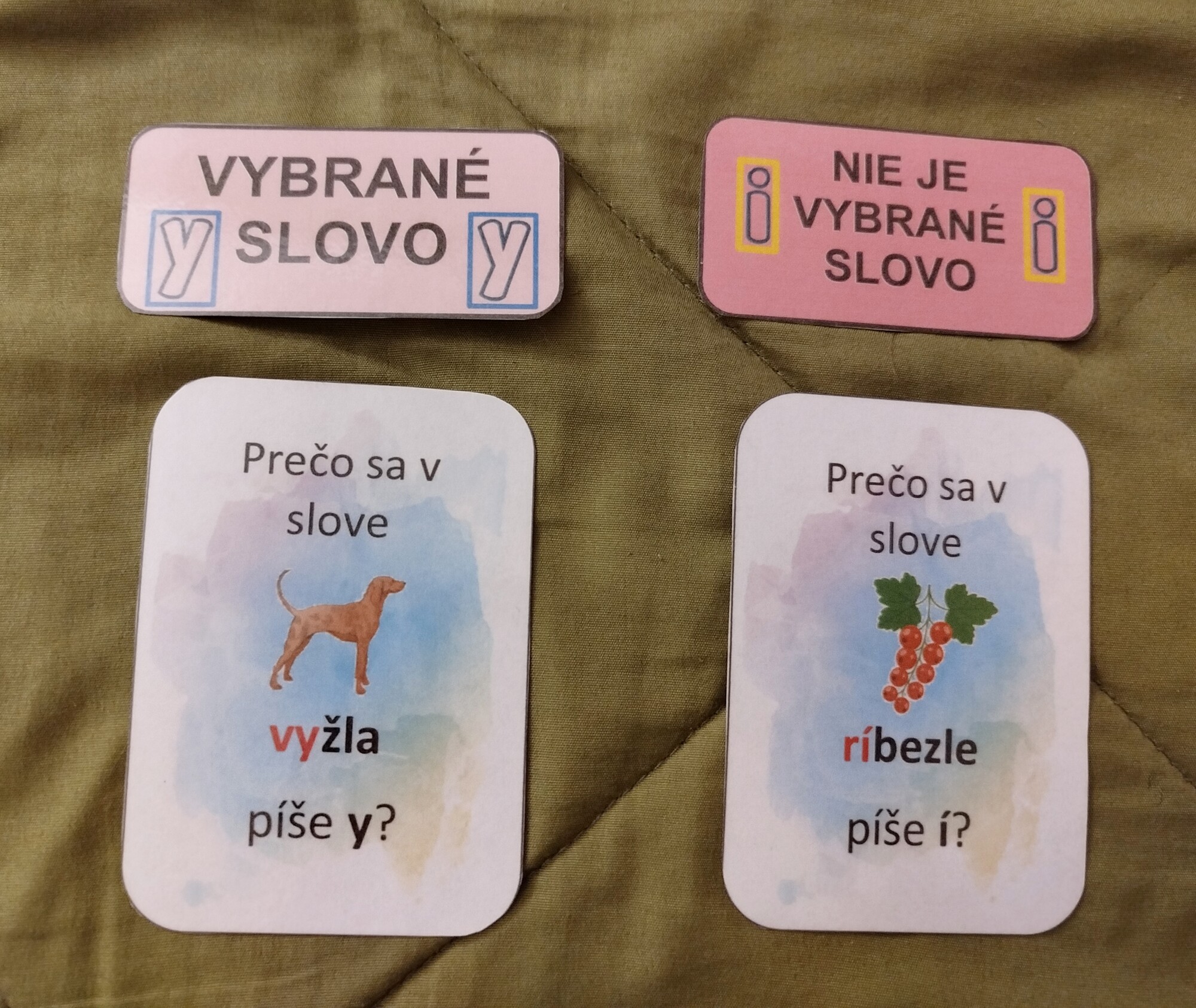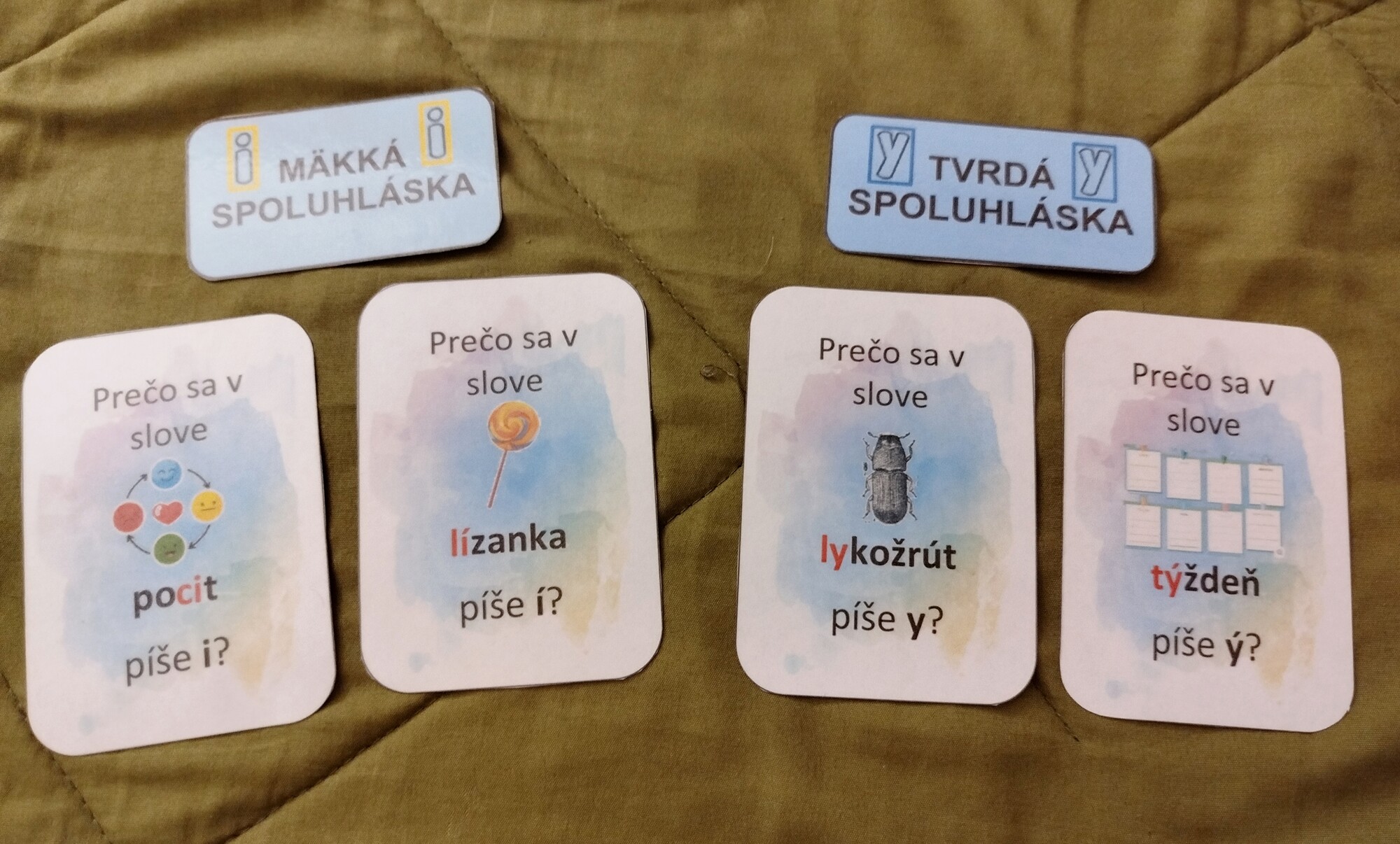 72 ks kartičiek, deti musia kartičky triediť podľa toho, prečo sa v danom slove píše mäkké alebo tvrdé y.