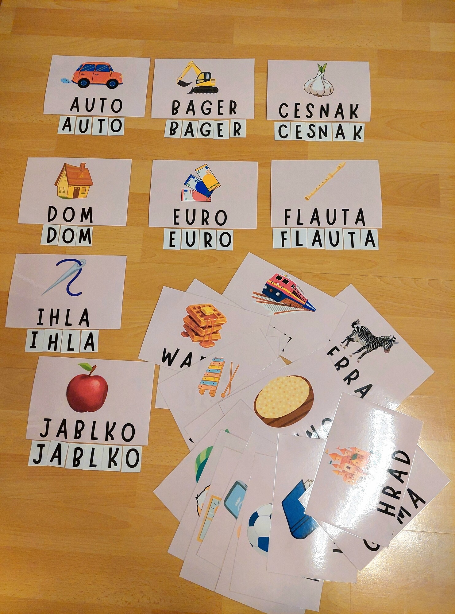 Kartičky na skladanie slov. Kartičky sú tvorené a zoradené podľa písmen základnej abecedy. Úlohou dieťaťa je poskladať správne slovo na základe obrázku a názvu pod obrázkom.