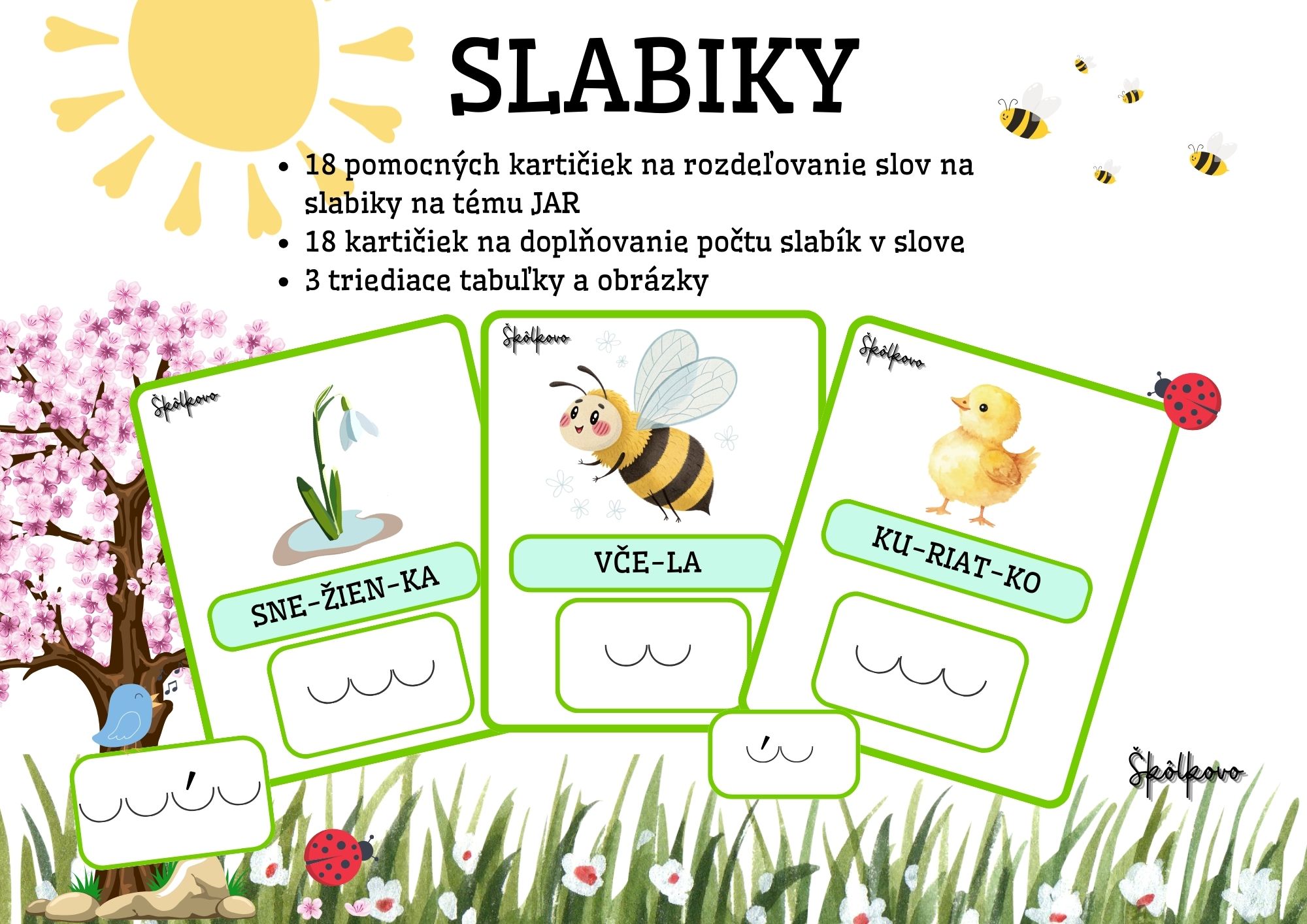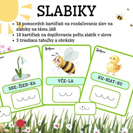 14 strán18 pomocných kartičiek na rozdeľovanie slov na slabiky na tému JAR18 kartičiek na doplňovanie počtu slabík v slove3 triediace tabuľky a obrázkyMateriál je potrebné vystrihnúť a zalaminovať.