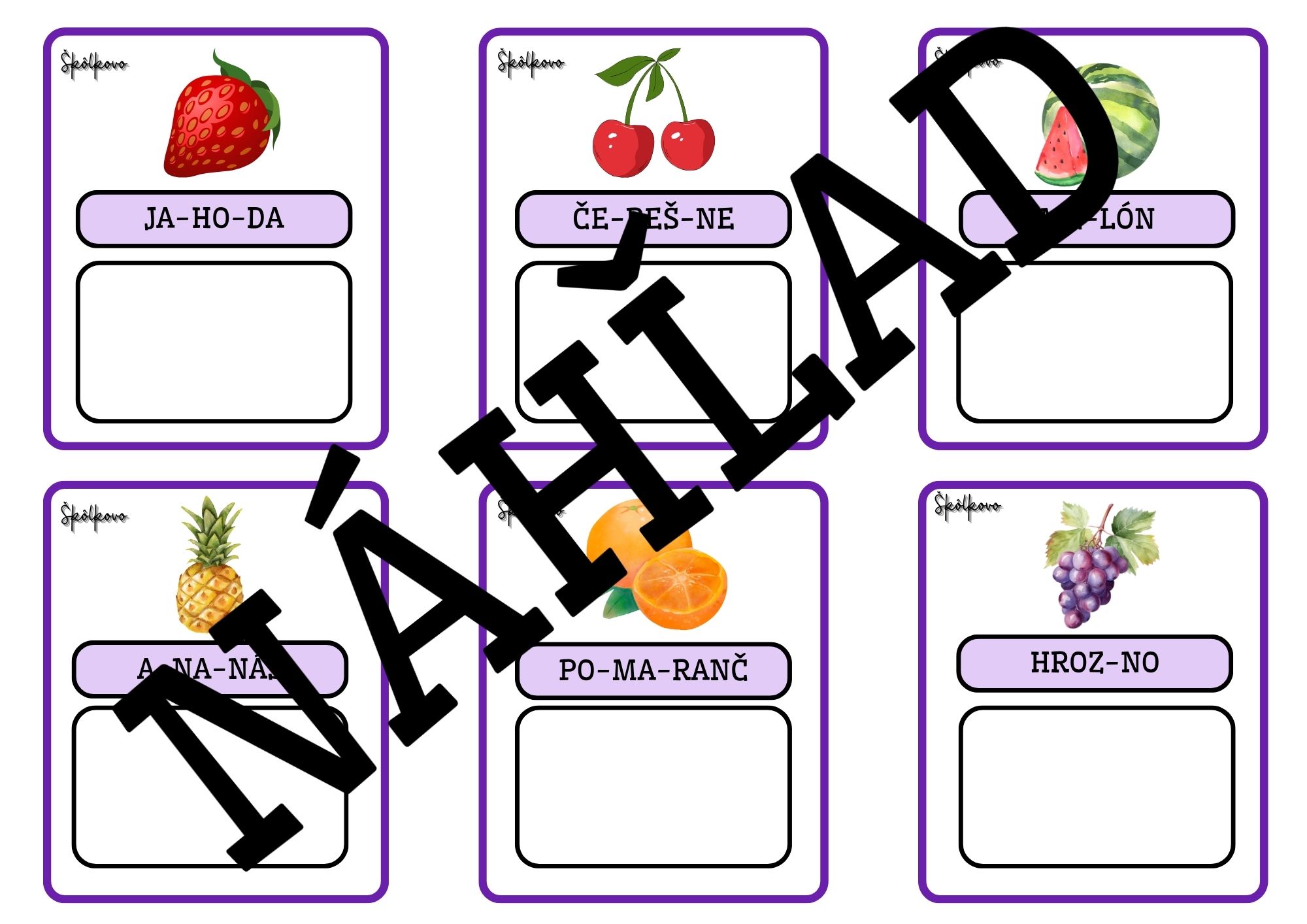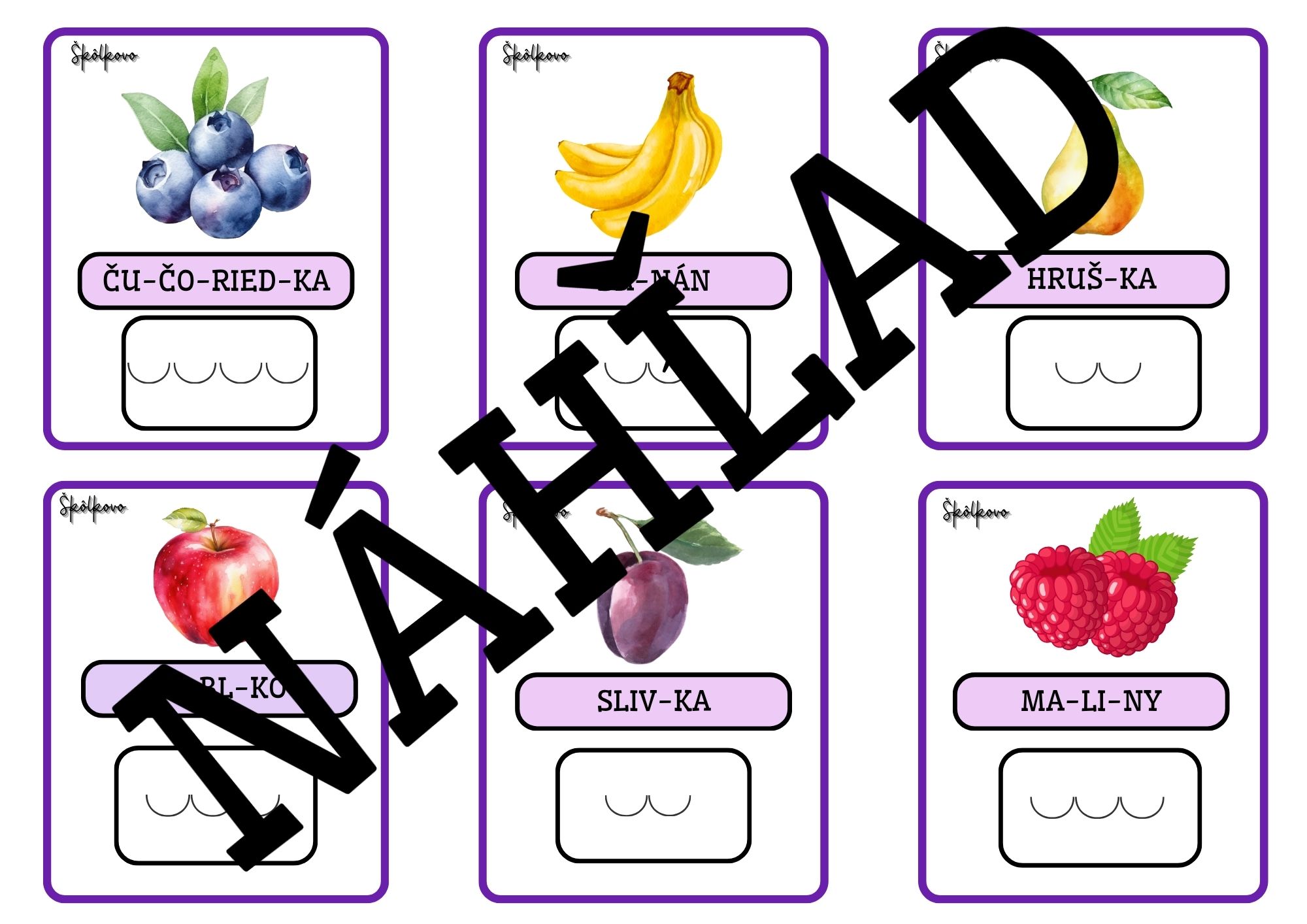Súbor obsahuje ilustrované kartičky so slovami určenými na rozvoj fonematického uvedomovania u detí predškolského veku. Deti sa pomocou obrázkov učia vnímať, počuť a rozdeľovať slová na slabiky.