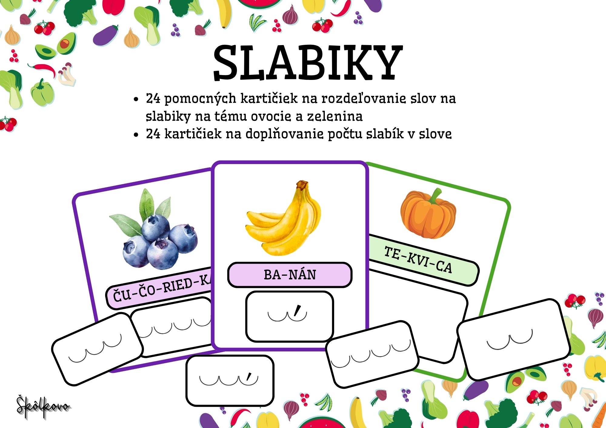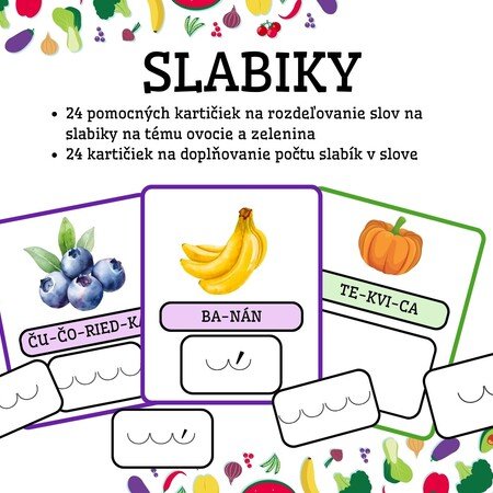 - 24 pomocných kartičiek na rozdeľovanie slov na slabiky na tému ovocie a zelenina