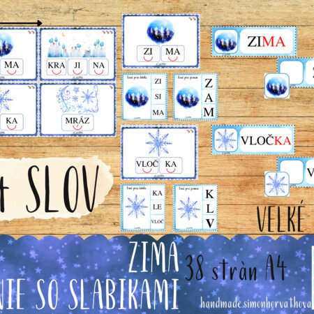 Aktivita s VEĽKÝM PÍSMOM zameraná na čítanie slov pomocou znazornených slabík. Súbor obsahuje 44 rôznych slov k téme zima. V súbore sa nachádza: