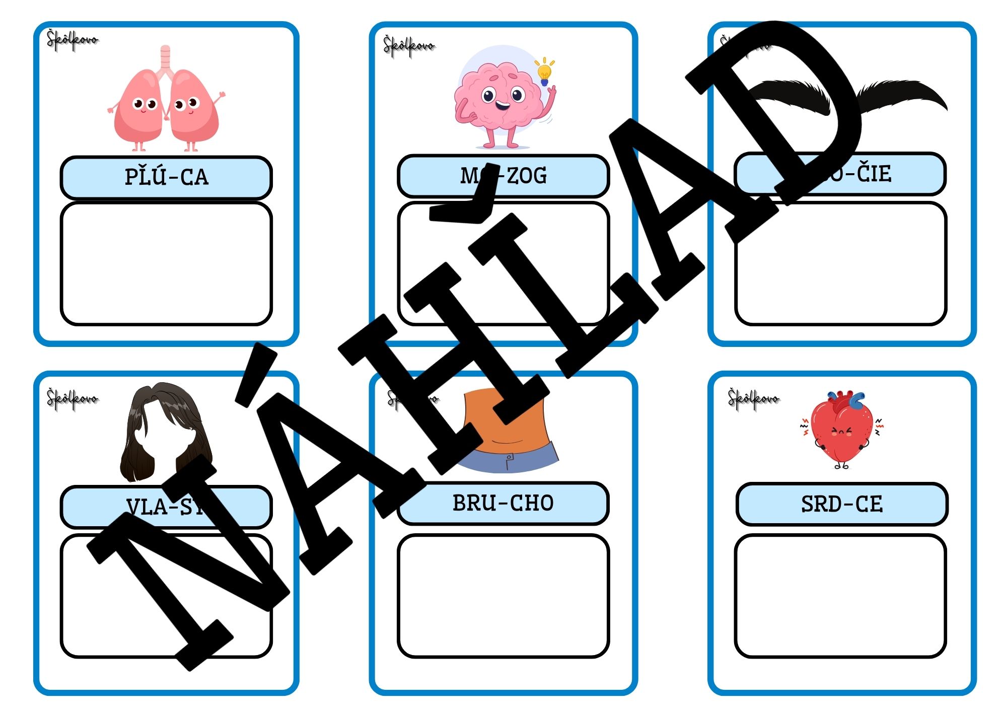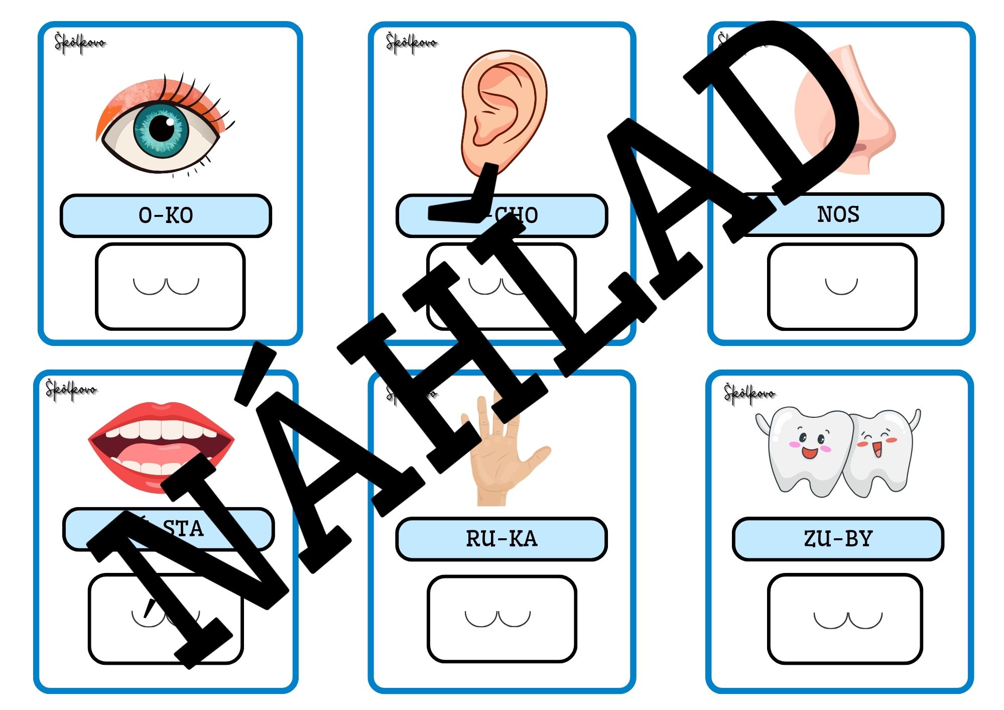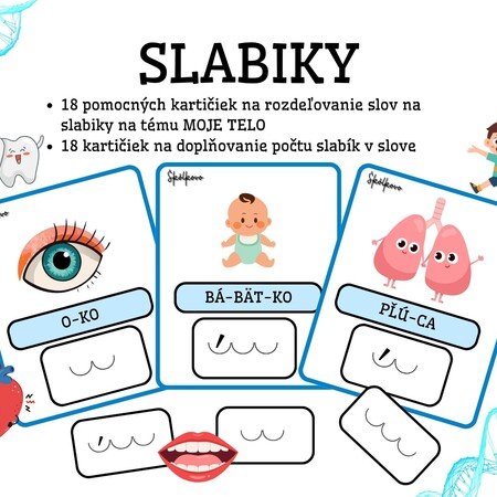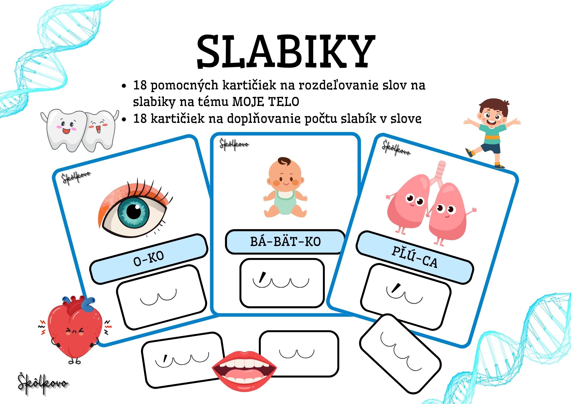 18 pomocných kartičiek na rozdeľovanie slov na slabiky na tému MOJE TELO18 kartičiek na doplňovanie počtu slabík v sloveMateriál je potrebné vystrihnúť a zalaminovať.