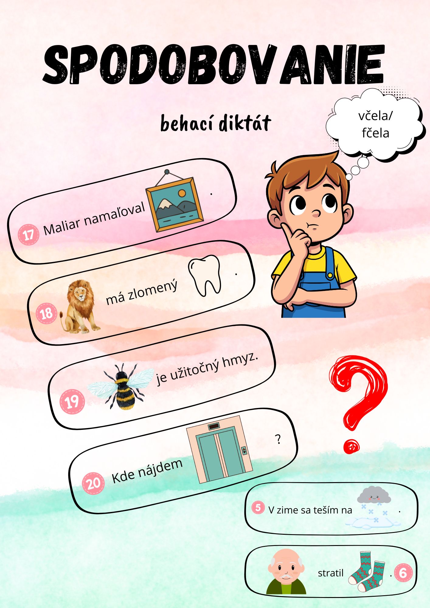 Súbor obsahuje 20 kartičiek, ktoré sú zamerané na precvičovanie spodobovania pre žiakov 4. ročníka. Slová, v ktorých dochádza k spodobovaniu sú nahradené obrázkami.